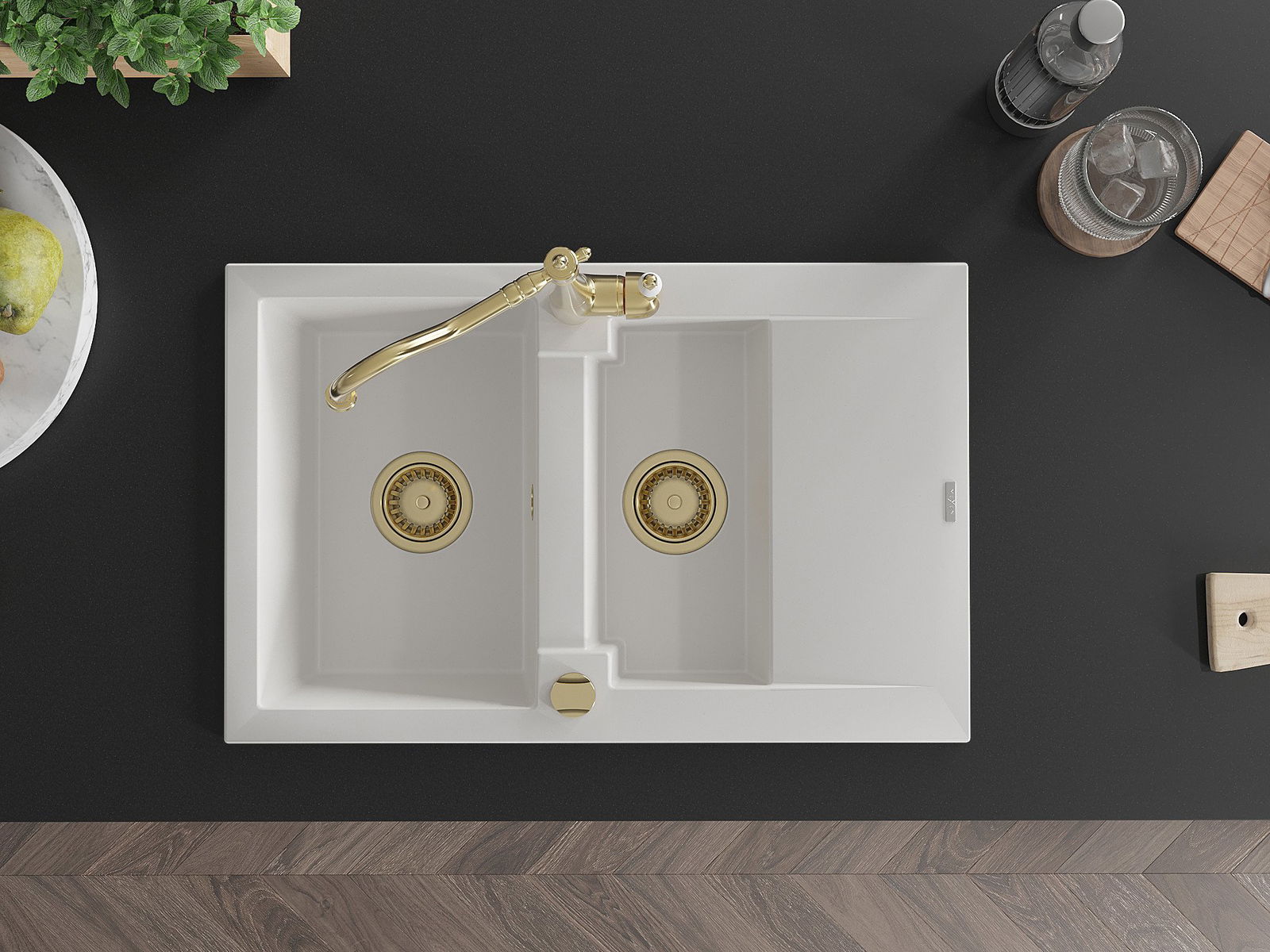 Mexen Pablo zlewozmywak granitowy 1-komorowy z ociekaczem i baterią kuchenną Carla, biały - 6510-20-670700-50