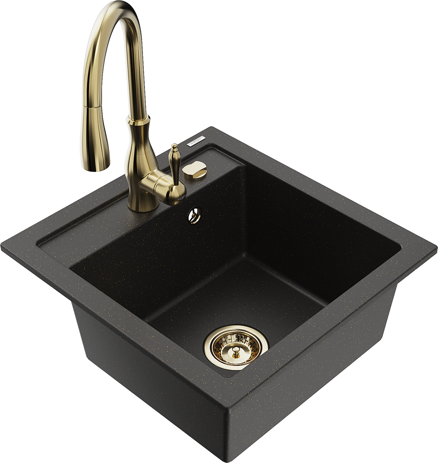 Mexen Vito zlewozmywak granitowy 1-komorowy z baterią kuchenną Savita, czarny/złoty metalik - 6503-75-672601-50