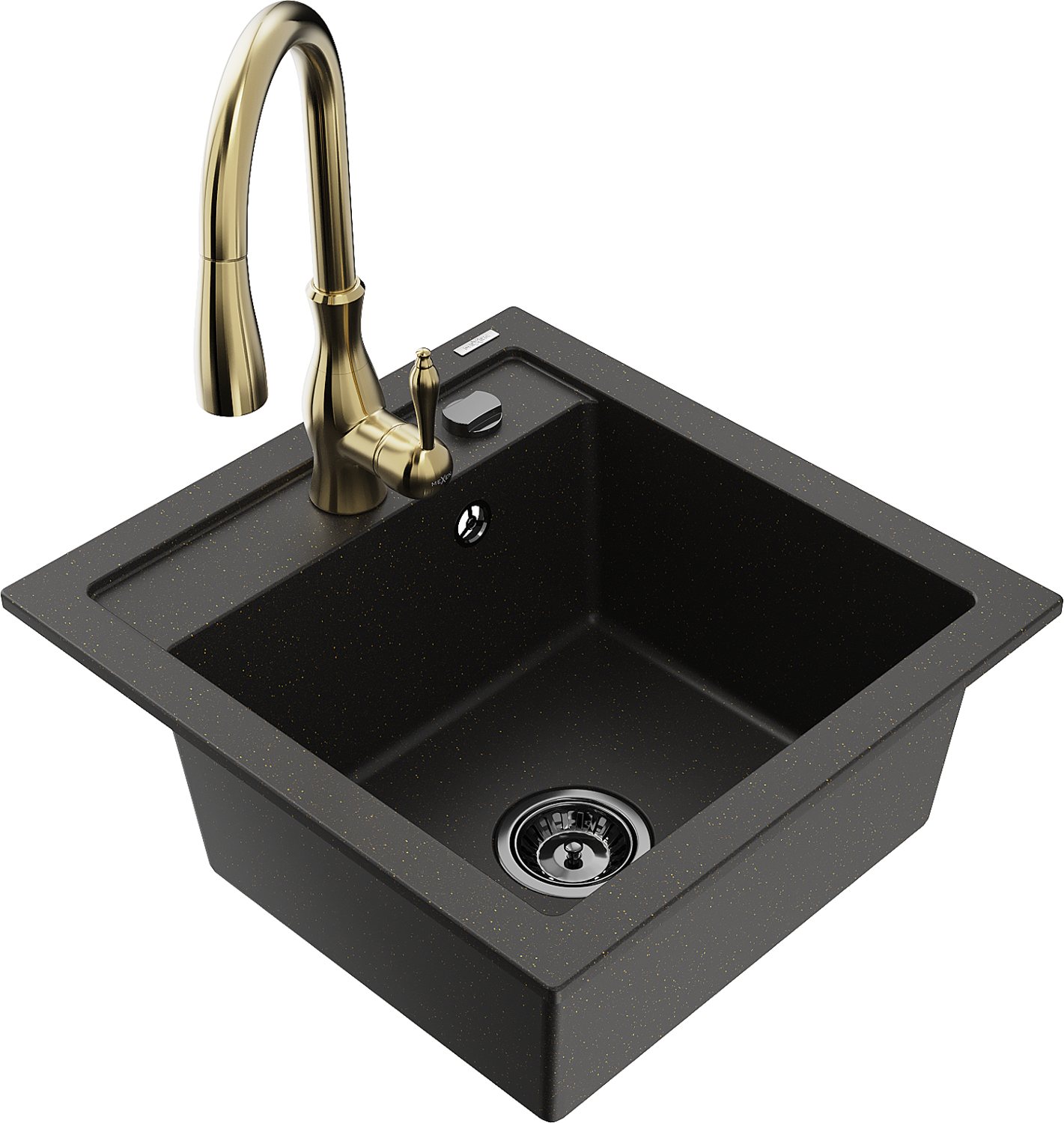Mexen Vito zlewozmywak granitowy 1-komorowy z baterią kuchenną Savita, czarny/złoty metalik - 6503-75-672601-50-B