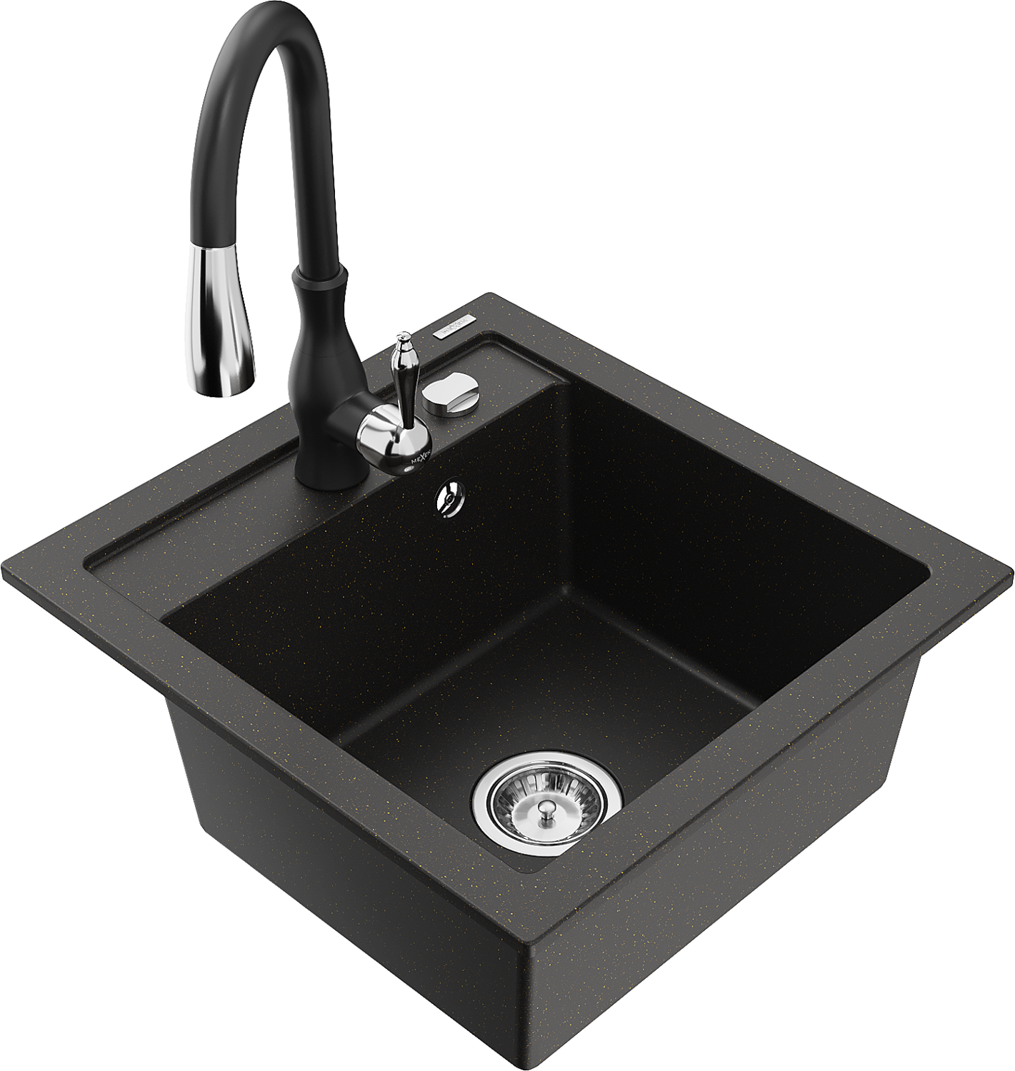 Mexen Vito zlewozmywak granitowy 1-komorowy z baterią kuchenną Savita, czarny/złoty metalik - 6503-75-672601-70