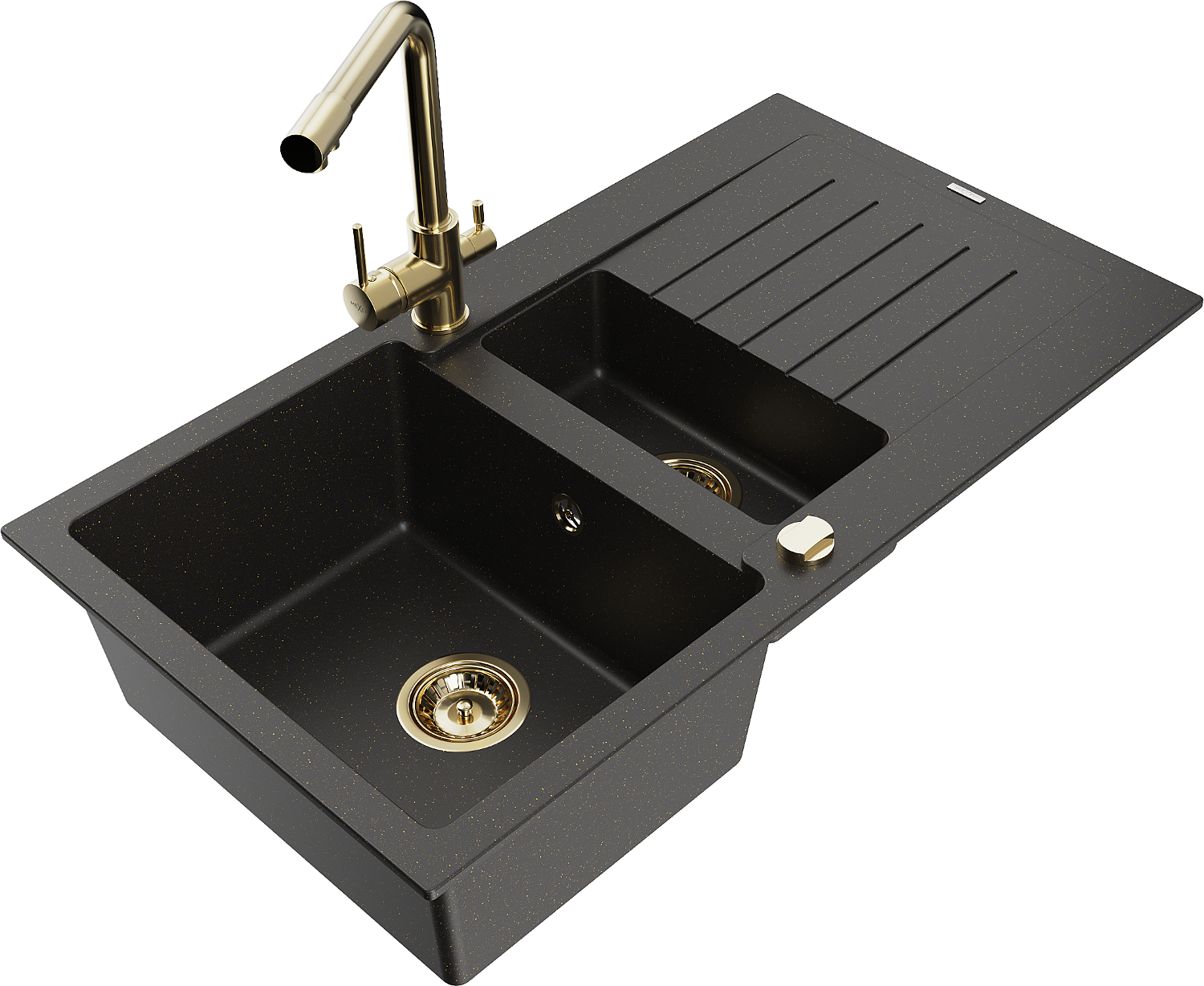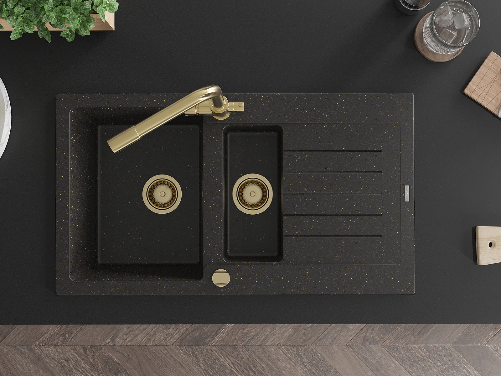 Mexen Matias zlewozmywak granitowy 1,5-komorowy z ociekaczem i baterią kuchenną Duero, czarny/złoty metalik - 6502-75-671600-50