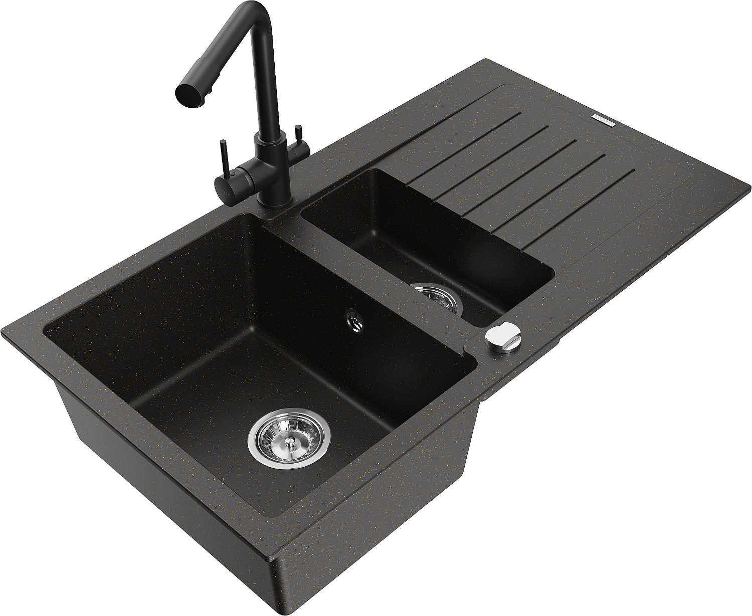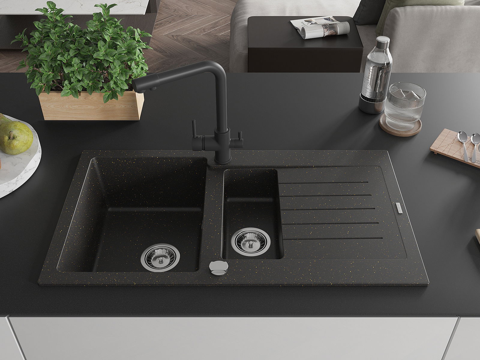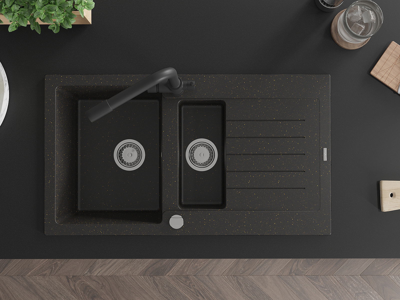 Mexen Matias zlewozmywak granitowy 1,5-komorowy z ociekaczem i baterią kuchenną Duero, czarny/złoty metalik - 6502-75-671600-70