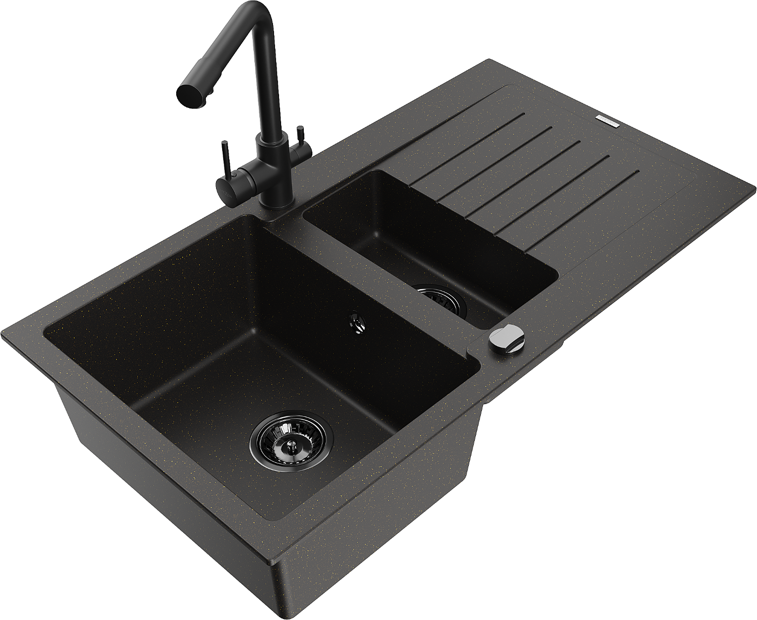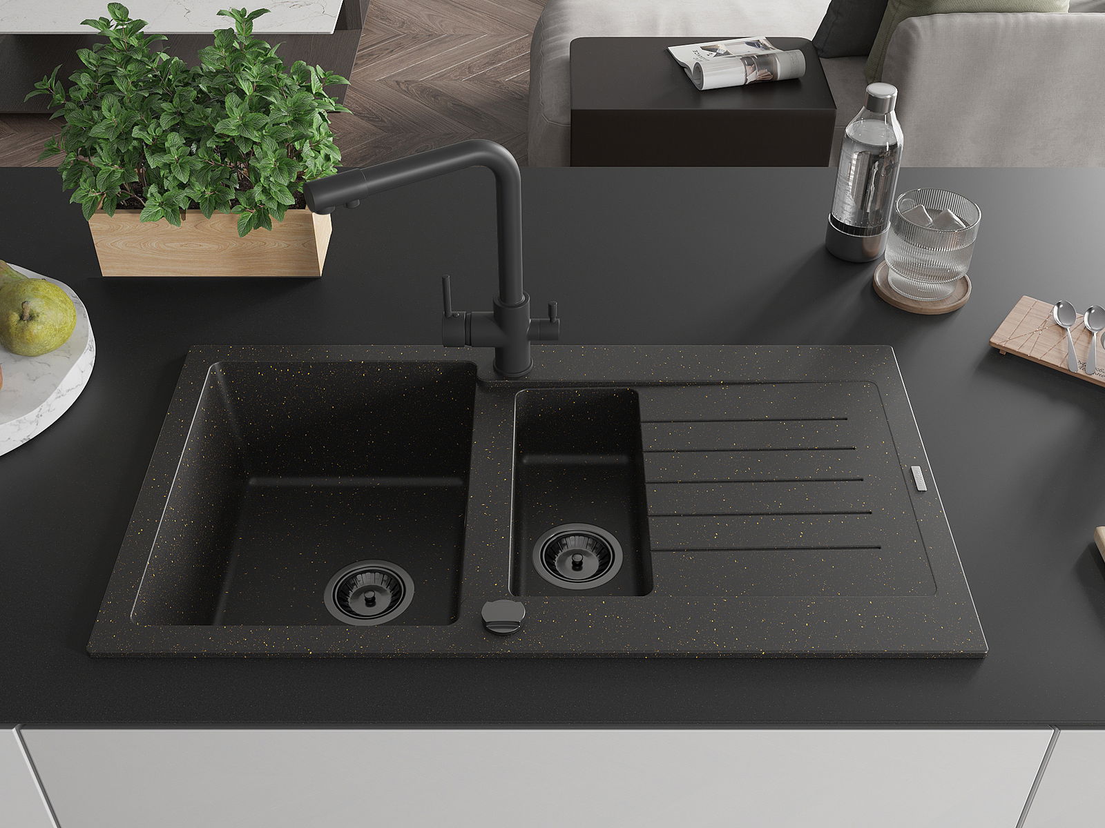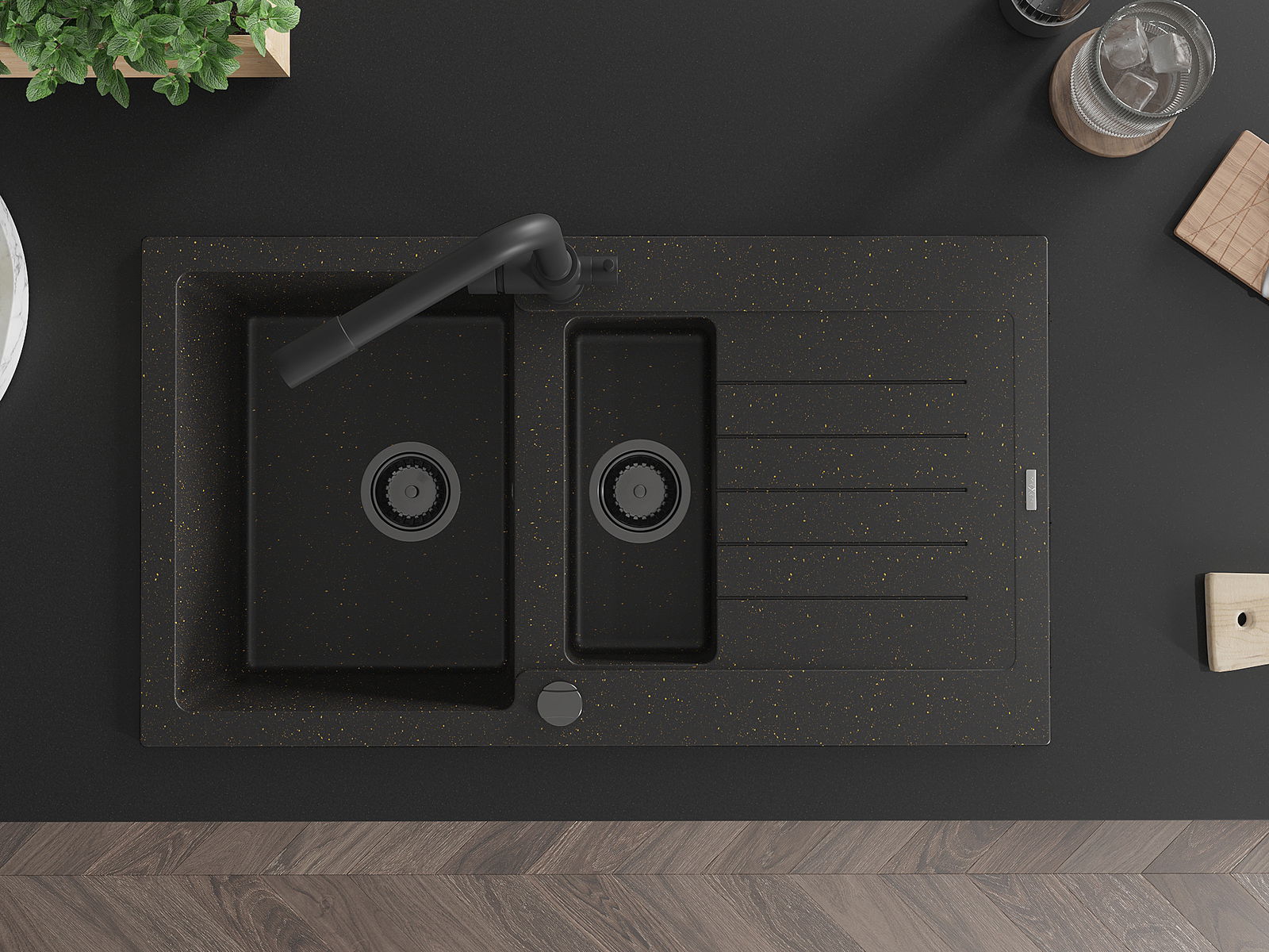 Mexen Matias zlewozmywak granitowy 1,5-komorowy z ociekaczem i baterią kuchenną Duero, czarny/złoty - 6502-75-671600-70-B