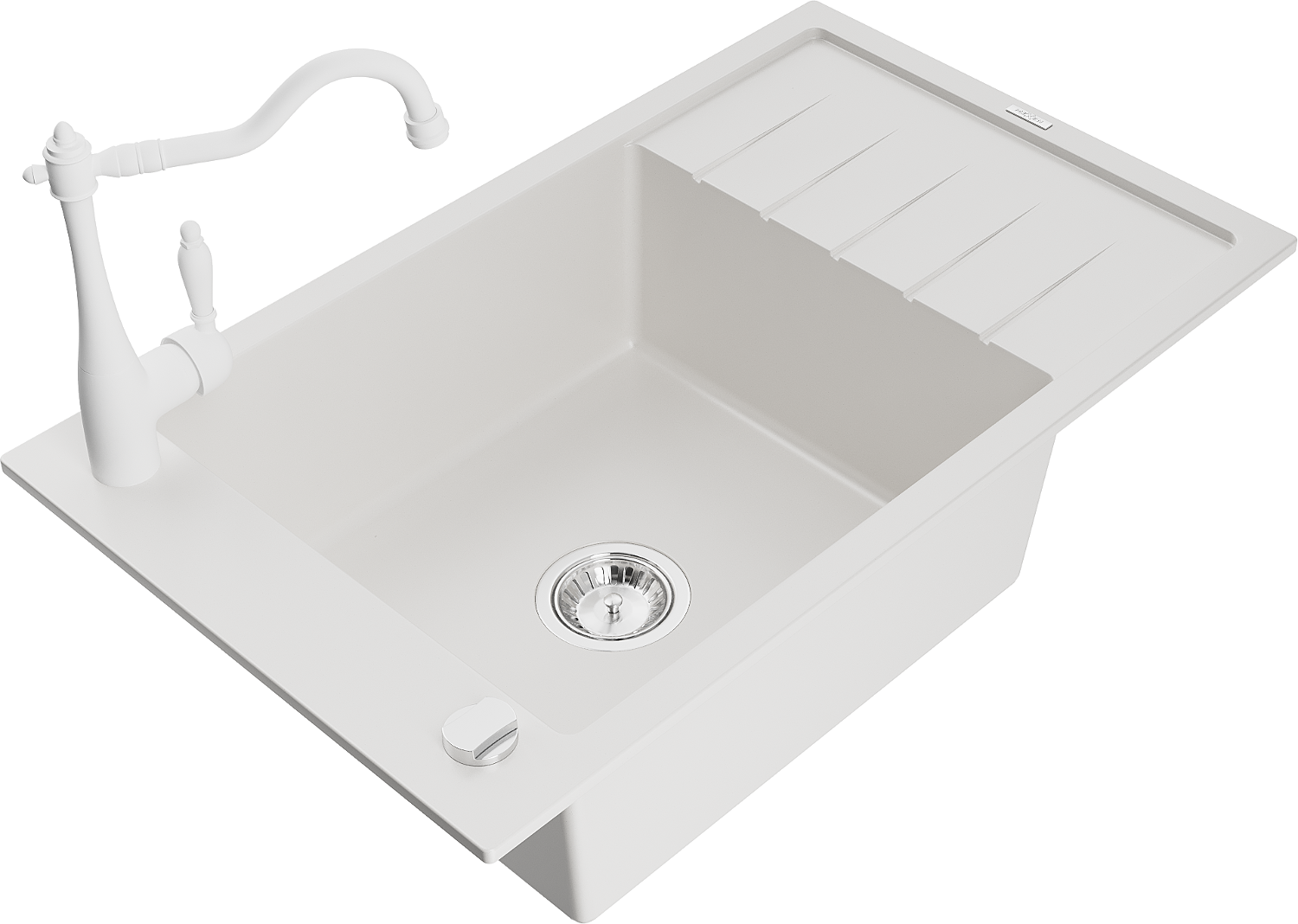 Mexen Elias zlewozmywak granitowy 1-komorowy z ociekaczem i baterią kuchenną Carla, biały - 6511-20-670700-20