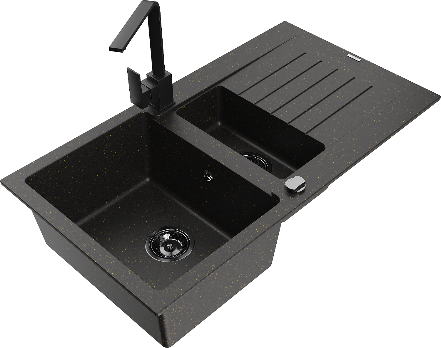 Mexen Matias zlewozmywak granitowy 1,5-komorowy z ociekaczem i baterią kuchenną Rita, czarny/złoty - 6502-75-670300-50-B