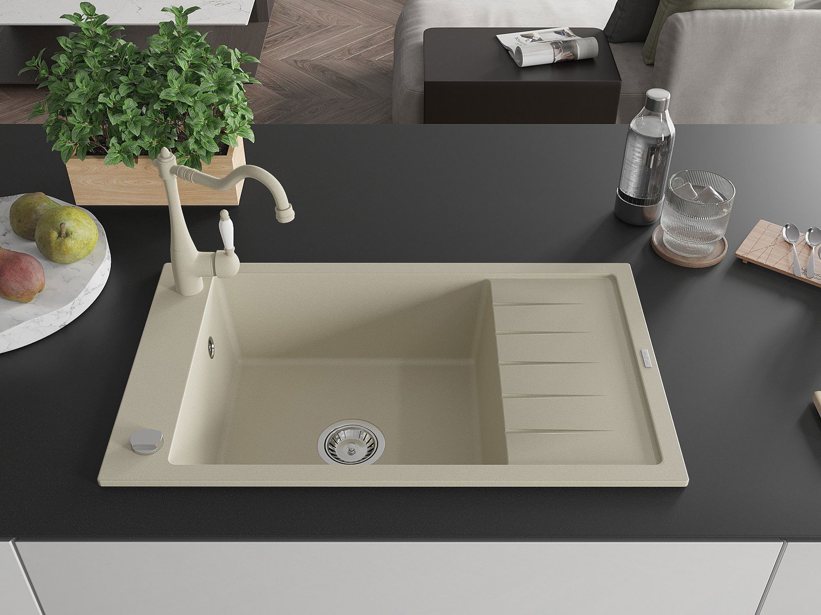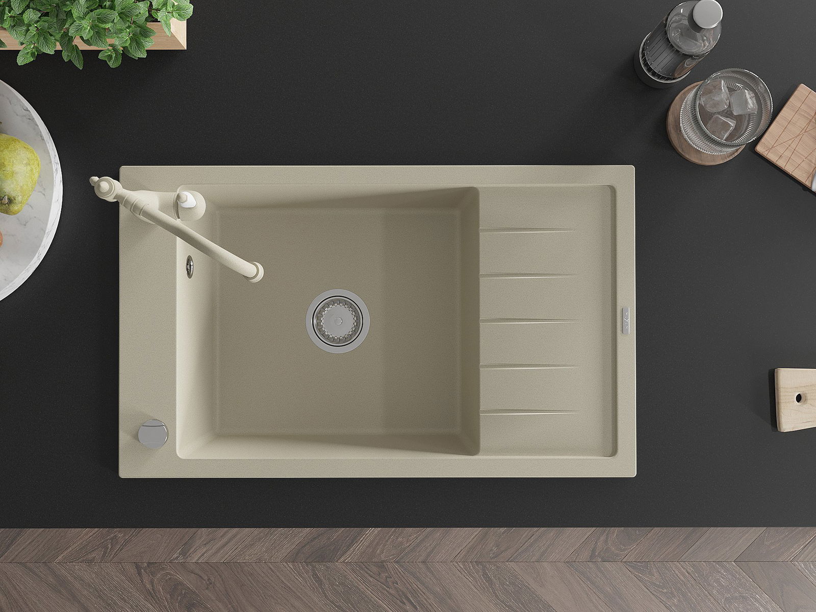 Mexen Elias zlewozmywak granitowy 1-komorowy z ociekaczem i baterią kuchenną Carla, beżowy - 6511-69-670700-69