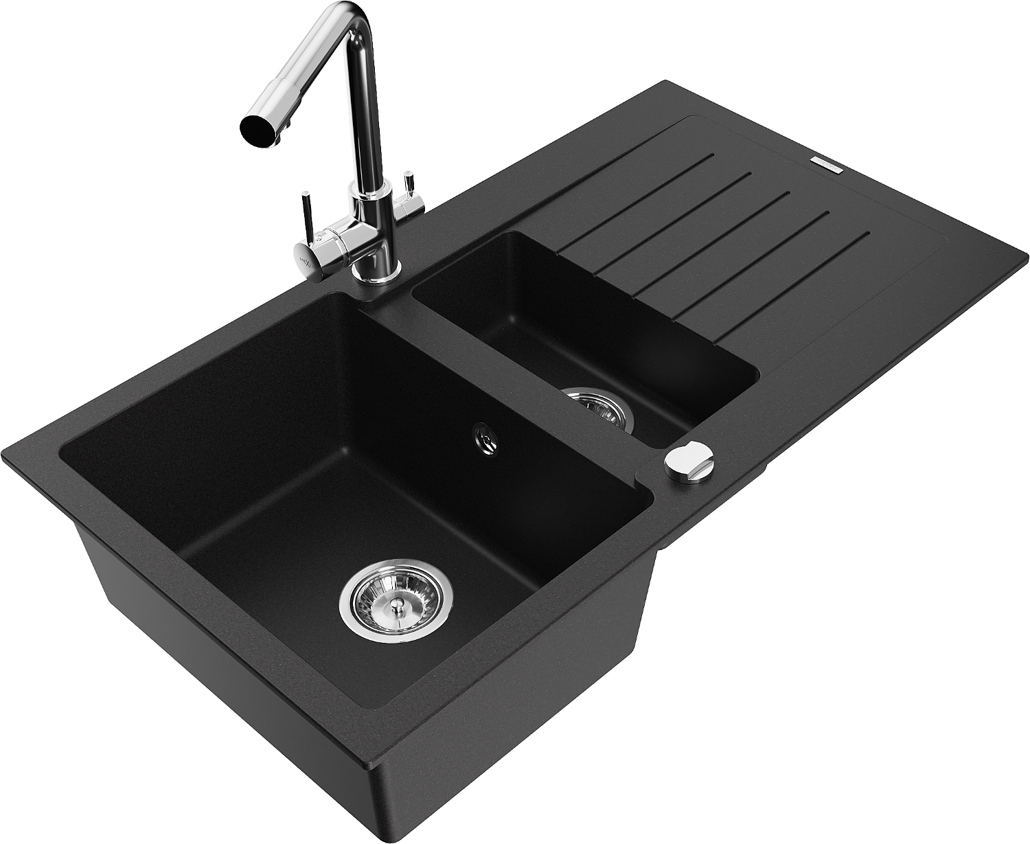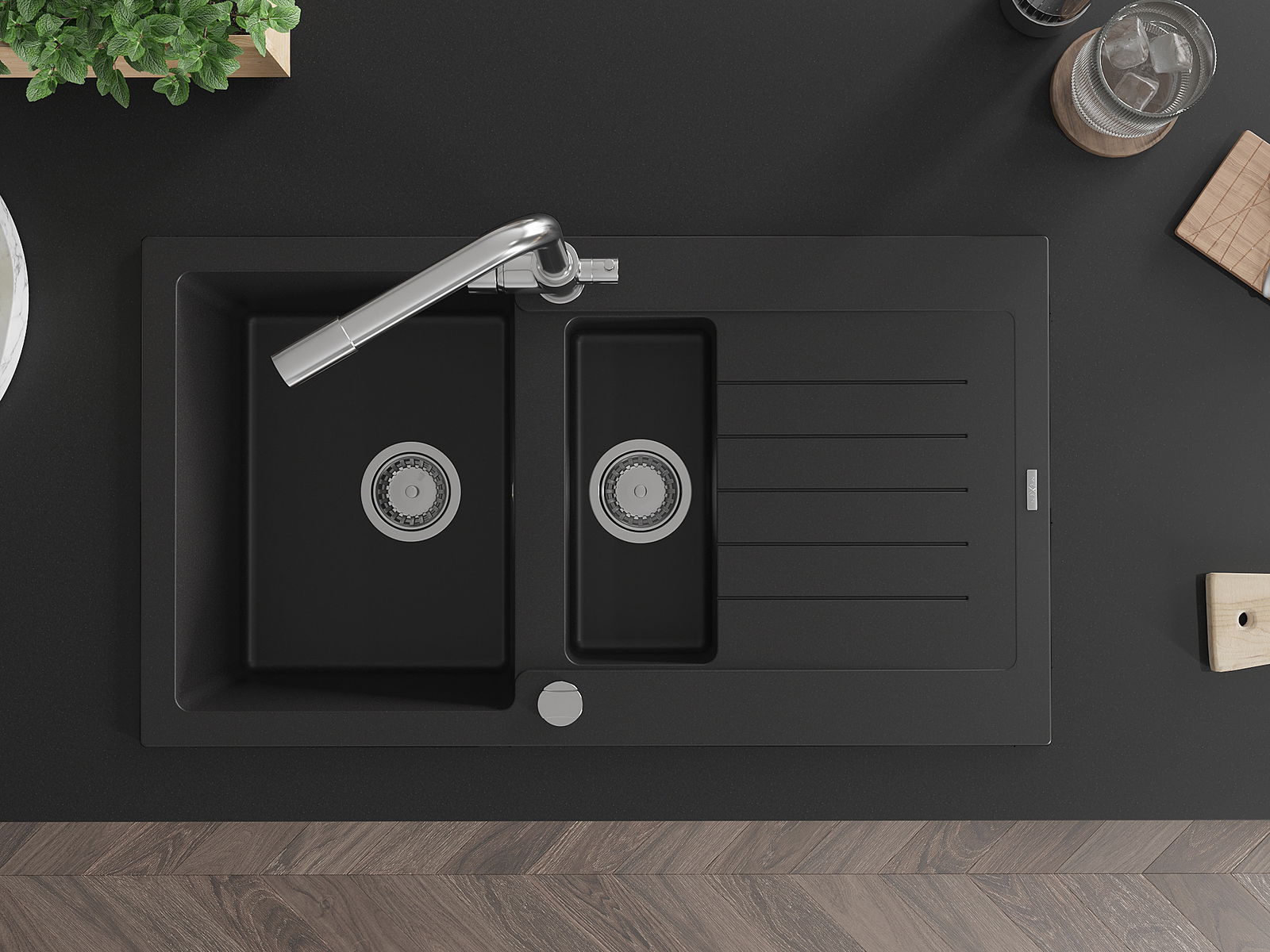 Mexen Matias zlewozmywak granitowy 1,5-komorowy z ociekaczem i baterią kuchenną Duero, czarny - 6502-77-671600-00