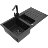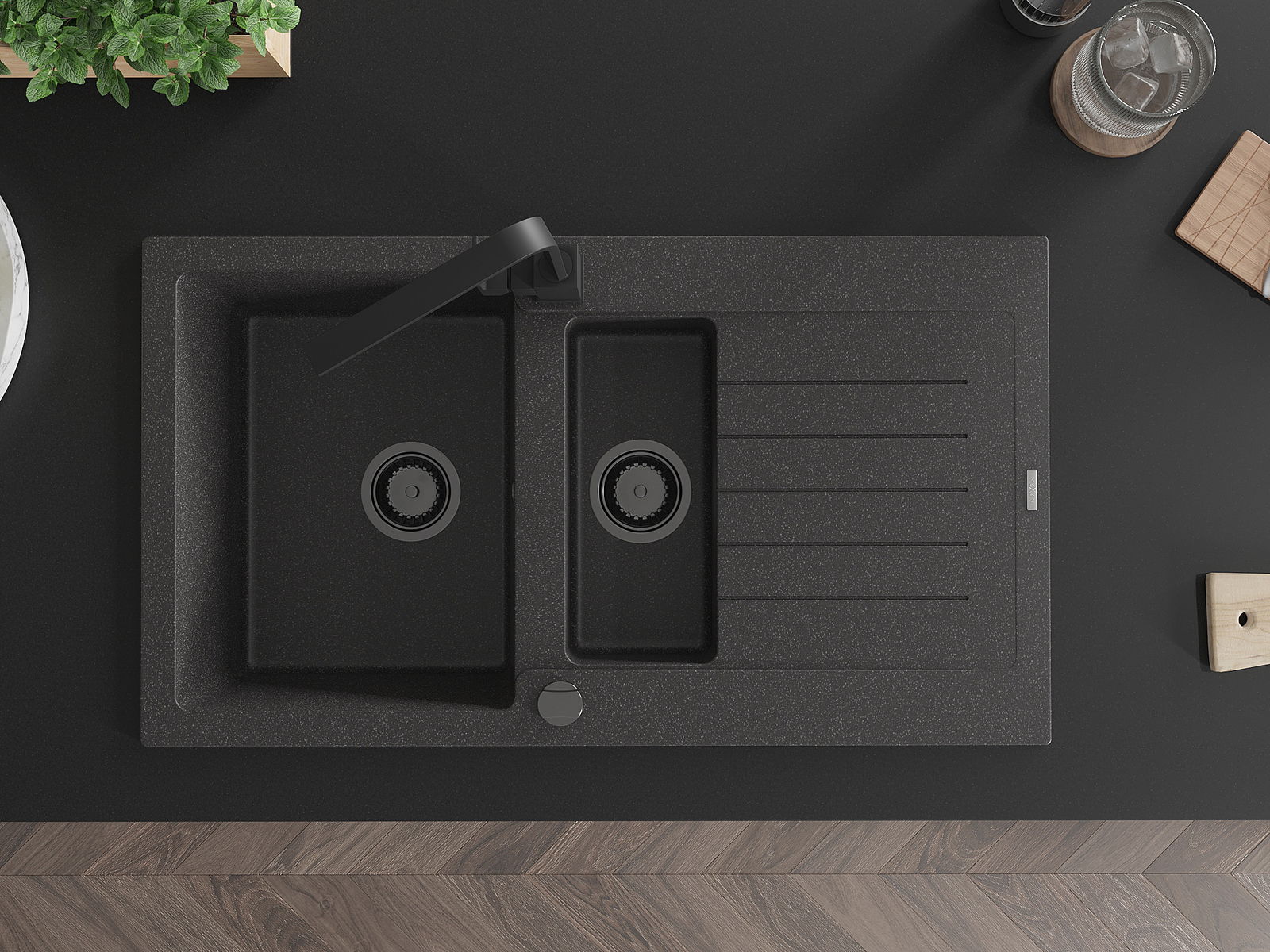 Mexen Matias zlewozmywak granitowy 1,5-komorowy z ociekaczem i baterią kuchenną Rita, czarny nakrapiany - 6502-76-670300-70-B