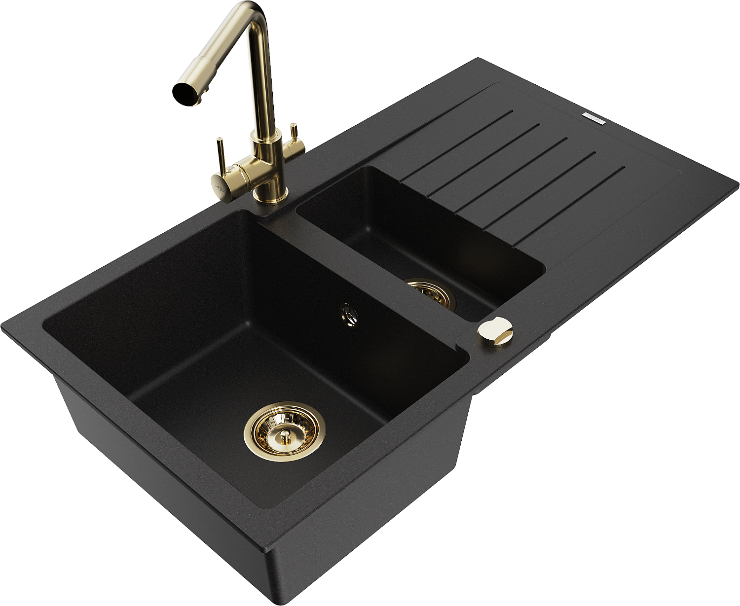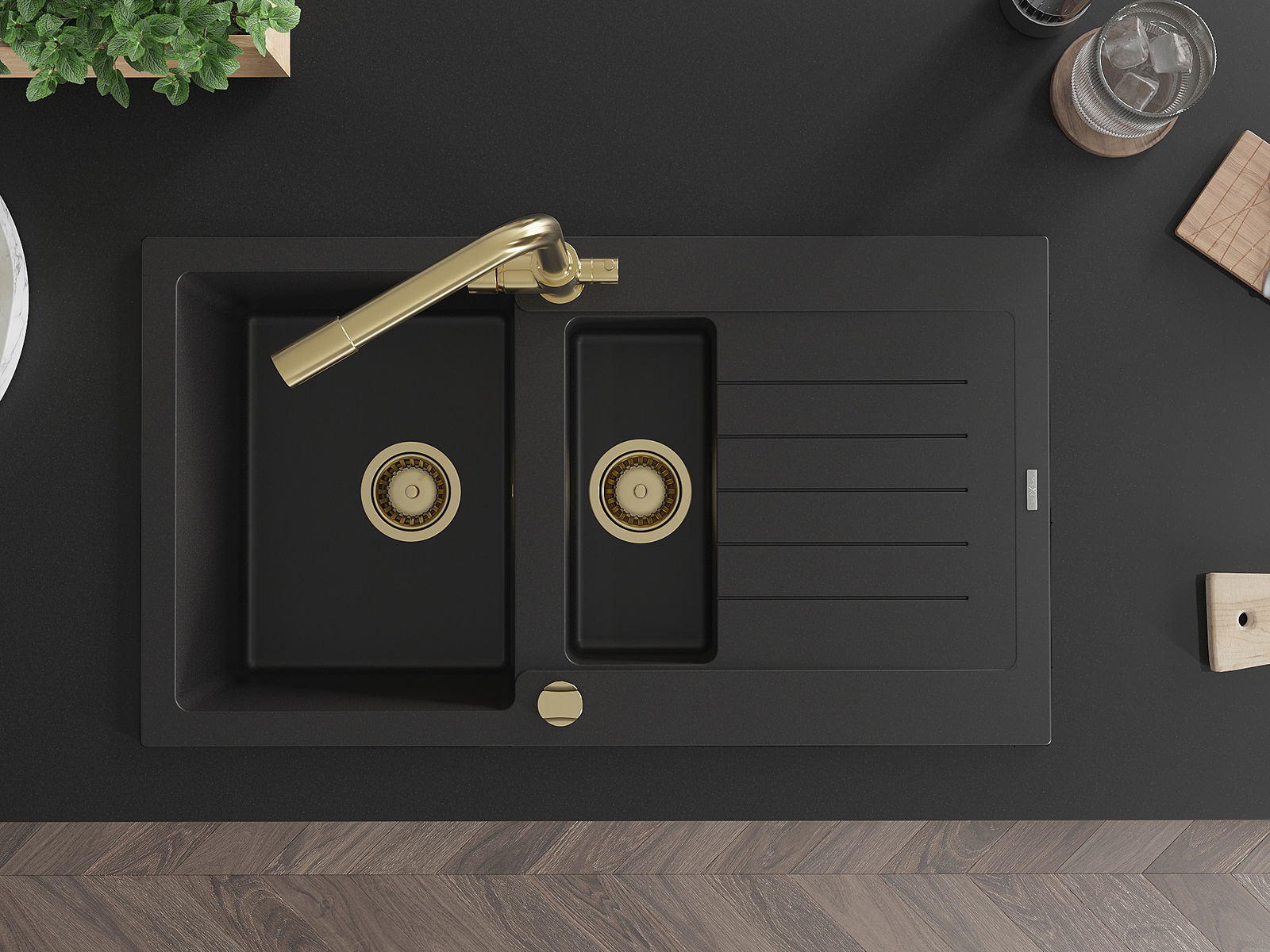 Mexen Matias zlewozmywak granitowy 1,5-komorowy z ociekaczem i baterią kuchenną Duero, czarny - 6502-77-671600-50