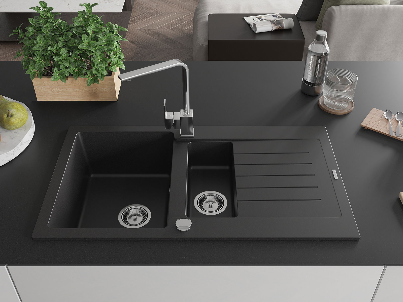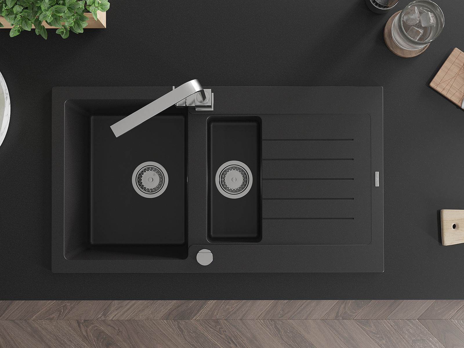 Mexen Matias zlewozmywak granitowy 1,5-komorowy z ociekaczem i baterią kuchenną Rita, czarny - 6502-77-670300-00