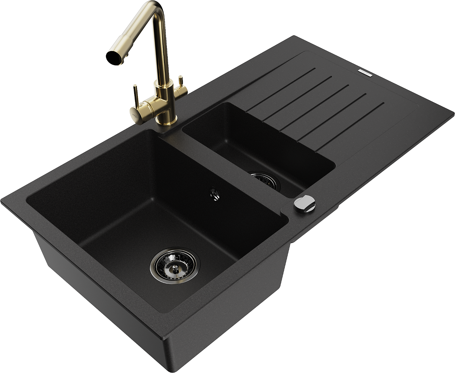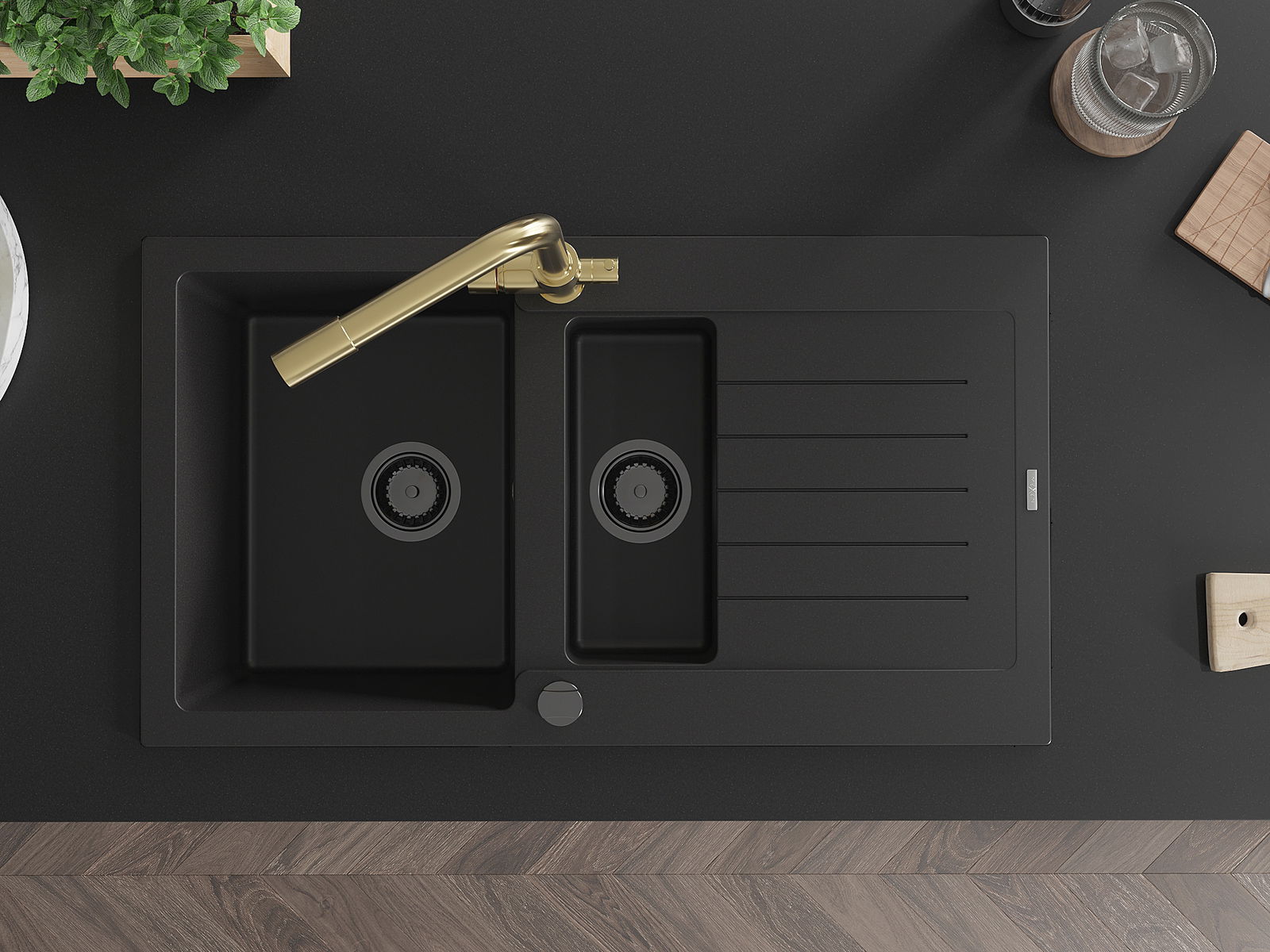 Mexen Matias zlewozmywak granitowy 1,5-komorowy z ociekaczem i baterią kuchenną Duero, czarny - 6502-77-671600-50-B