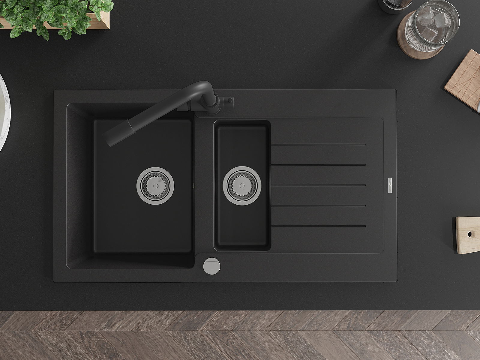 Dzięki zastosowaniu uniwersalnego systemu mocowania, zlew jest odwracalny, a ociekacz może zostać zamontowany na blacie po lewej lub prawej stronie. W ten sposób możesz z łatwością dopasować stronę do swoich potrzeb i warunków.
