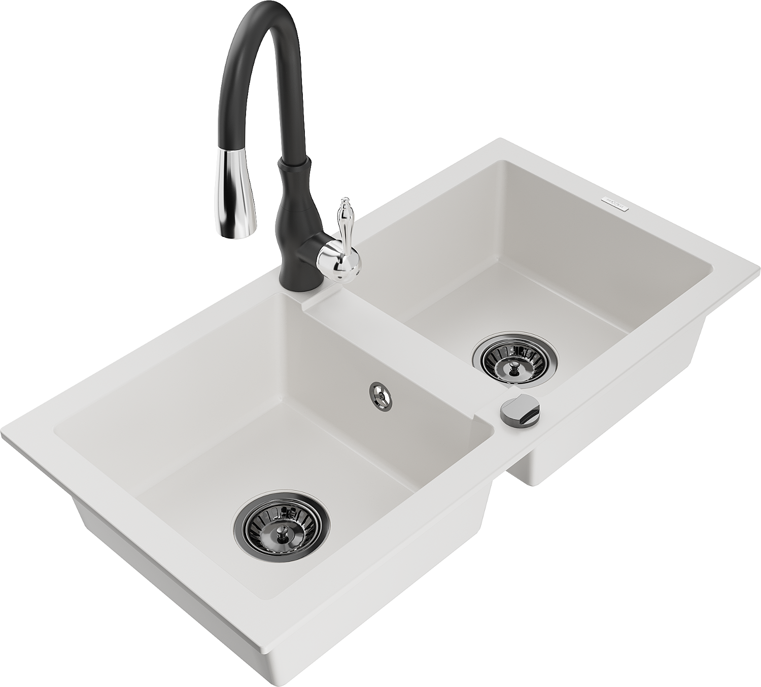 Mexen Mario zlewozmywak granitowy 2-komorowy z baterią kuchenną Savita, biały - 6504-20-672601-70