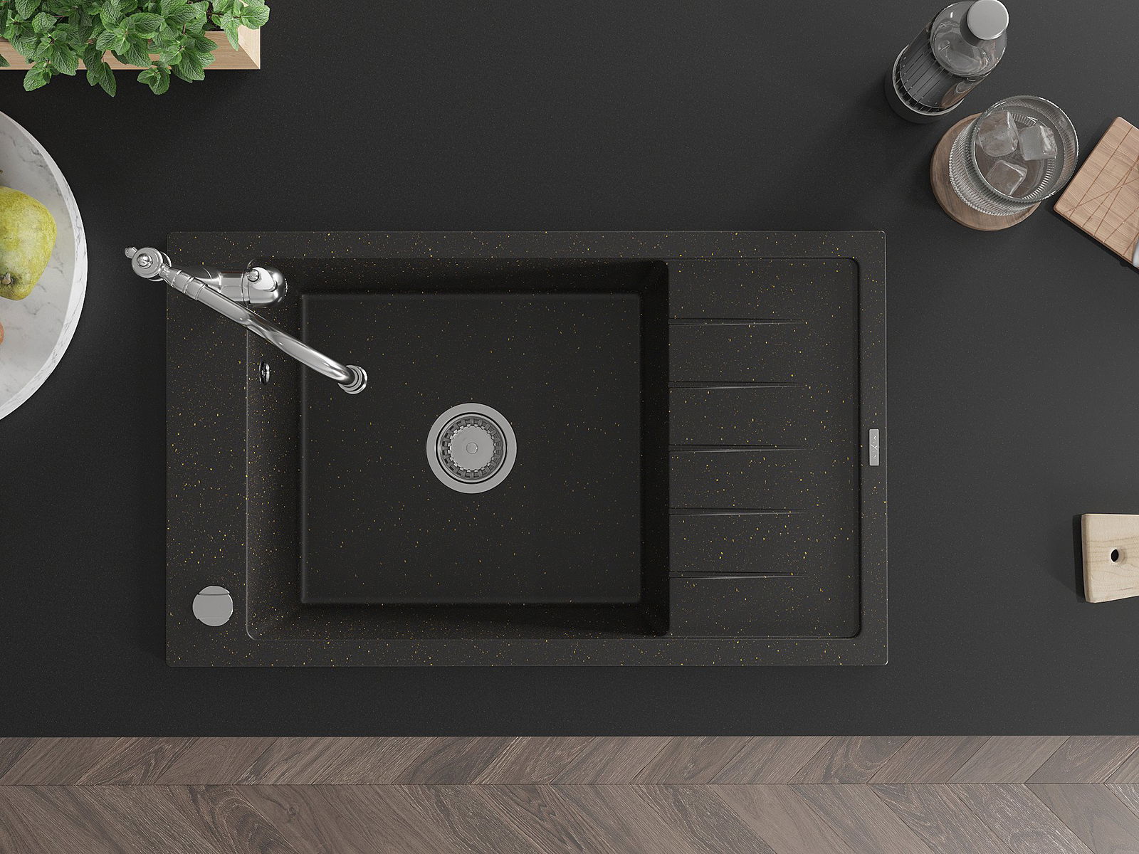 Mexen Elias zlewozmywak granitowy 1-komorowy z ociekaczem i baterią kuchenną Carla, czarny/złoty metalik - 6511-75-670700-00