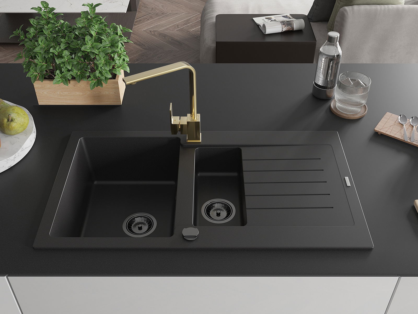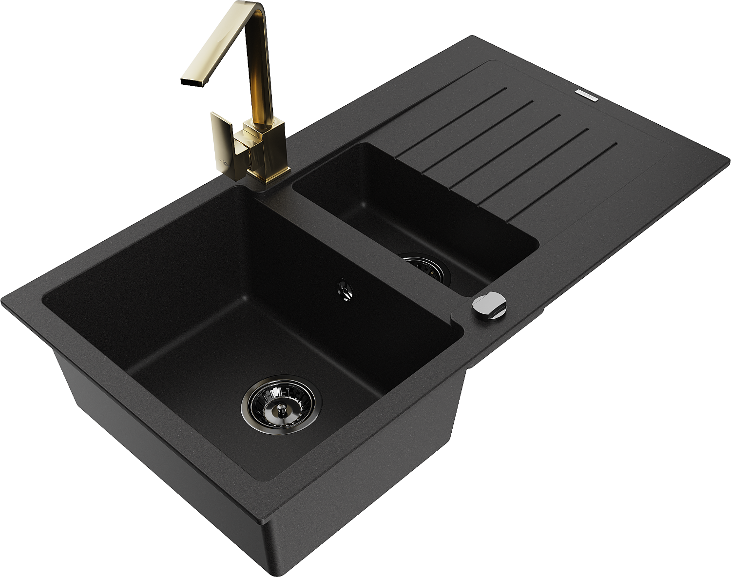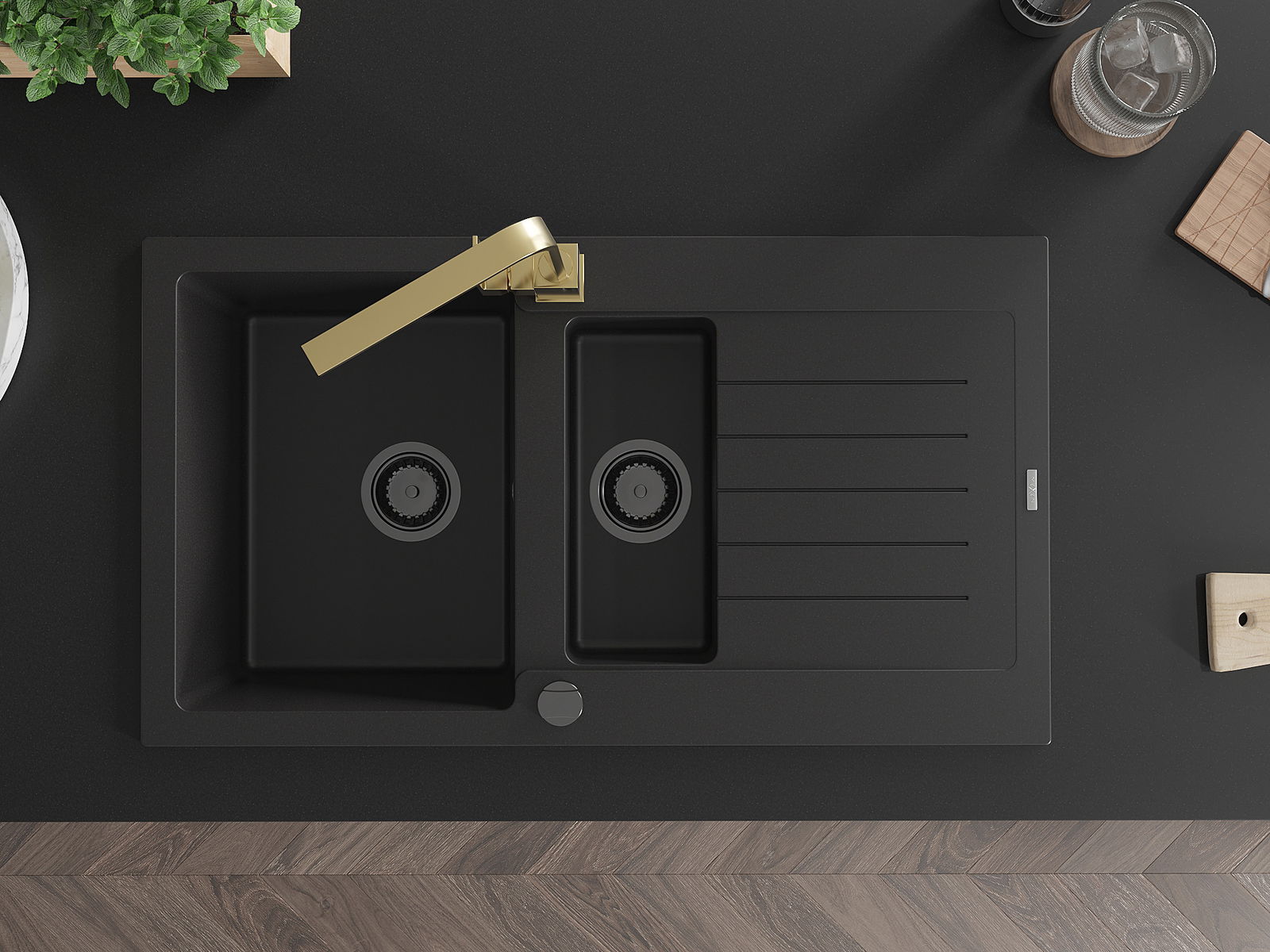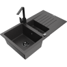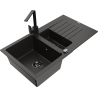 Mexen Matias zlewozmywak granitowy 1,5-komorowy z ociekaczem i baterią kuchenną Rita, czarny - 6502-77-670300-50-B