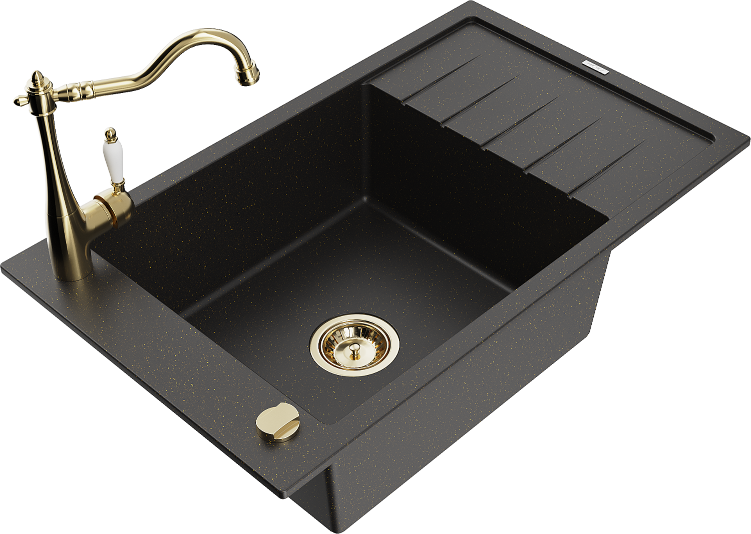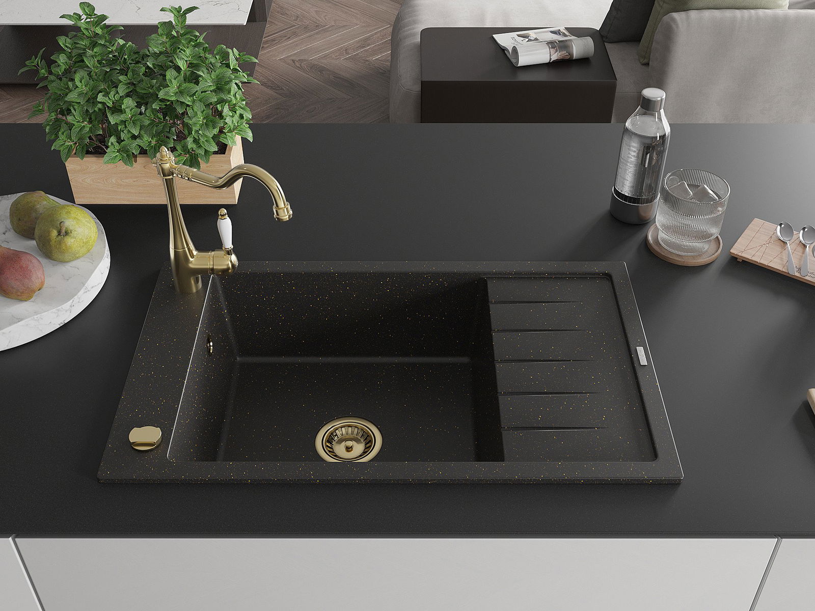 Mexen Elias zlewozmywak granitowy 1-komorowy z ociekaczem i baterią kuchenną Carla, czarny/złoty metalik - 6511-75-670700-50