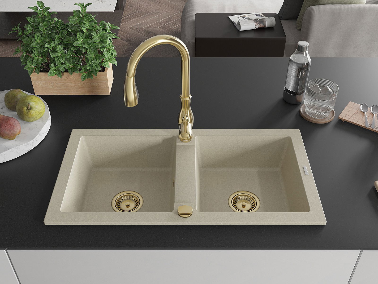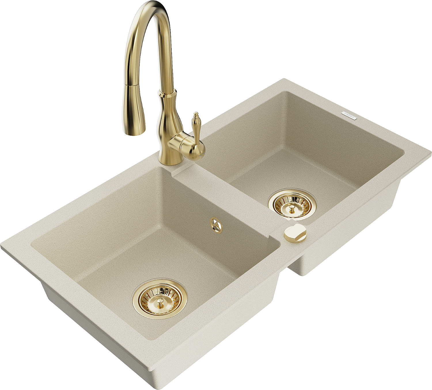 Mexen Mario zlewozmywak granitowy 2-komorowy z baterią kuchenną Savita, beżowy - 6504-69-672601-50