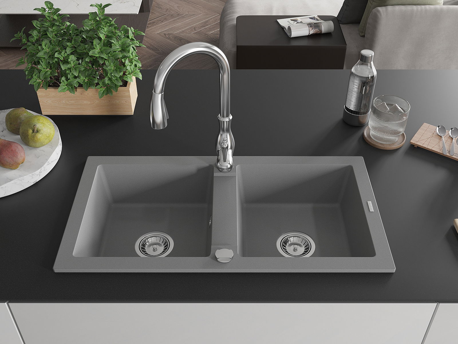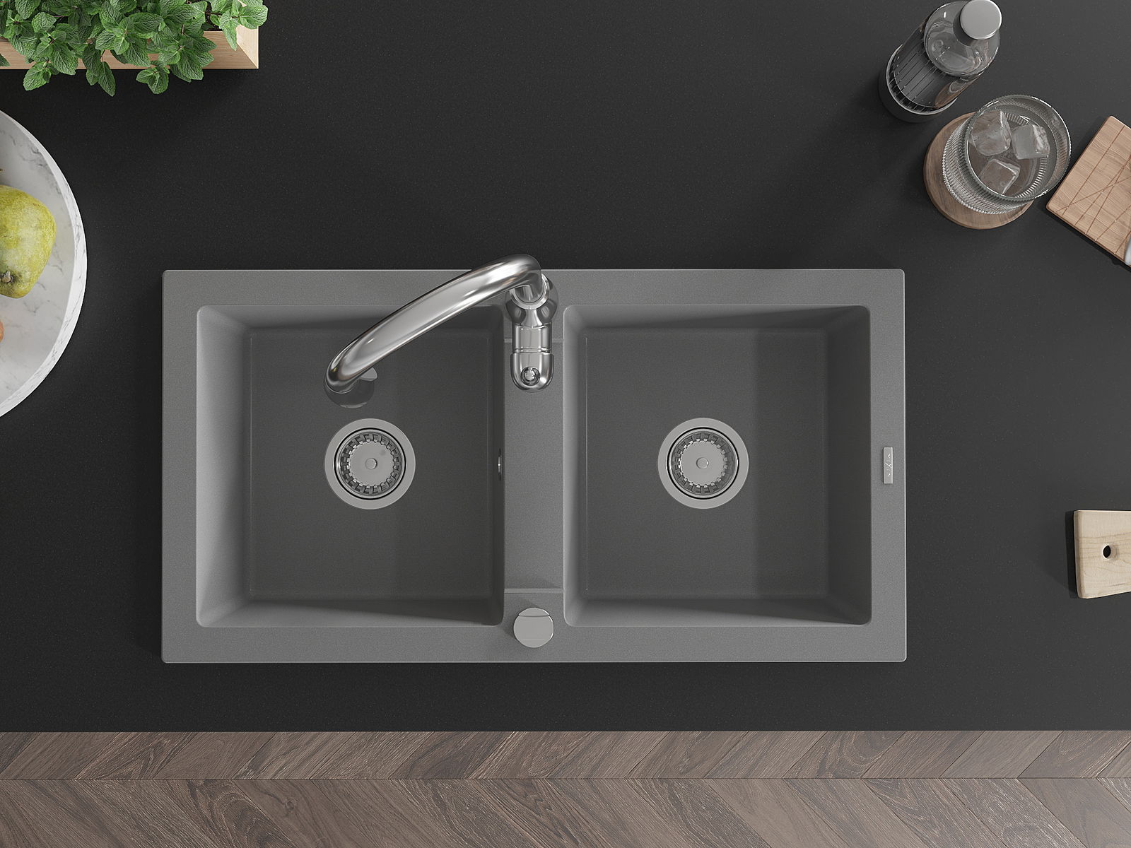 Mexen Mario zlewozmywak granitowy 2-komorowy z baterią kuchenną Savita, szary - 6504-71-672601-00