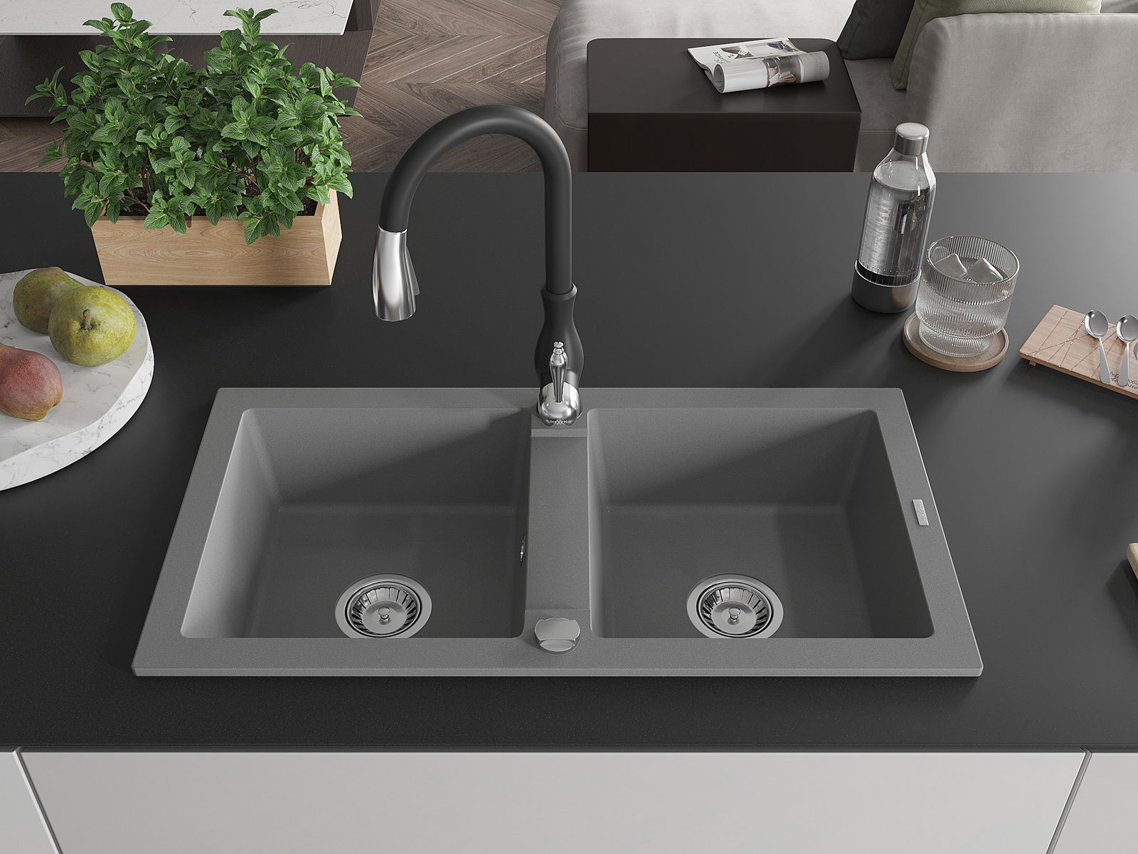 Mexen Mario zlewozmywak granitowy 2-komorowy z baterią kuchenną Savita, szary - 6504-71-672601-70