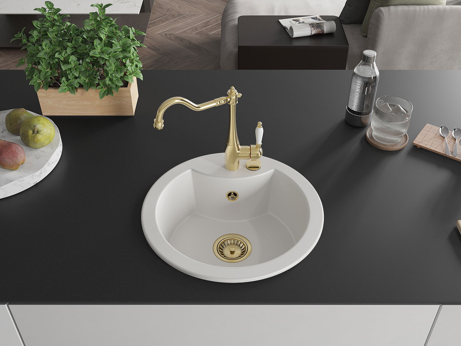 Zlew posiada podfrezowany otwór o średnicy 35 mm do samodzielnego wybicia. Można go wykorzystać m.in. do montażu dozownika na płyn, który wyeliminuje obecność plastikowych butelek w kuchni i nada jej eleganckiego wykończenia.