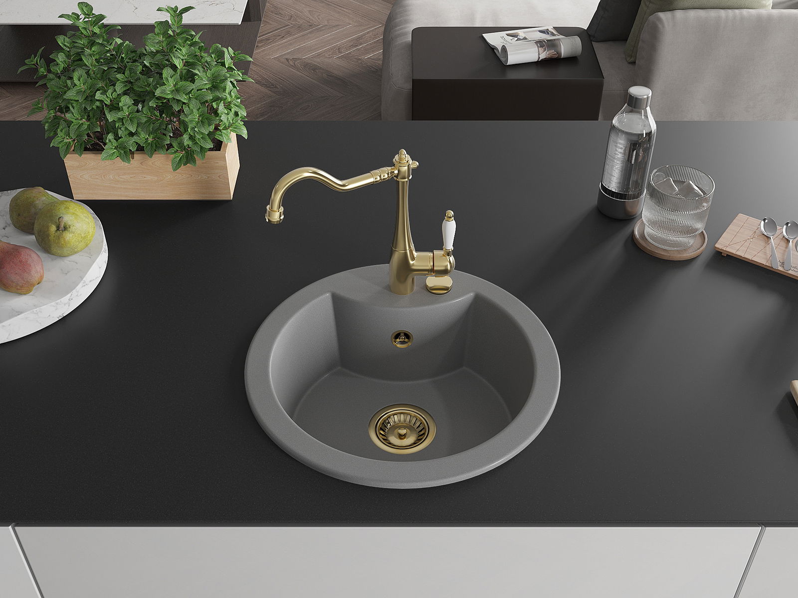 Zlew posiada podfrezowany otwór o średnicy 35 mm do samodzielnego wybicia. Można go wykorzystać m.in. do montażu dozownika na płyn, który wyeliminuje obecność plastikowych butelek w kuchni i nada jej eleganckiego wykończenia.
