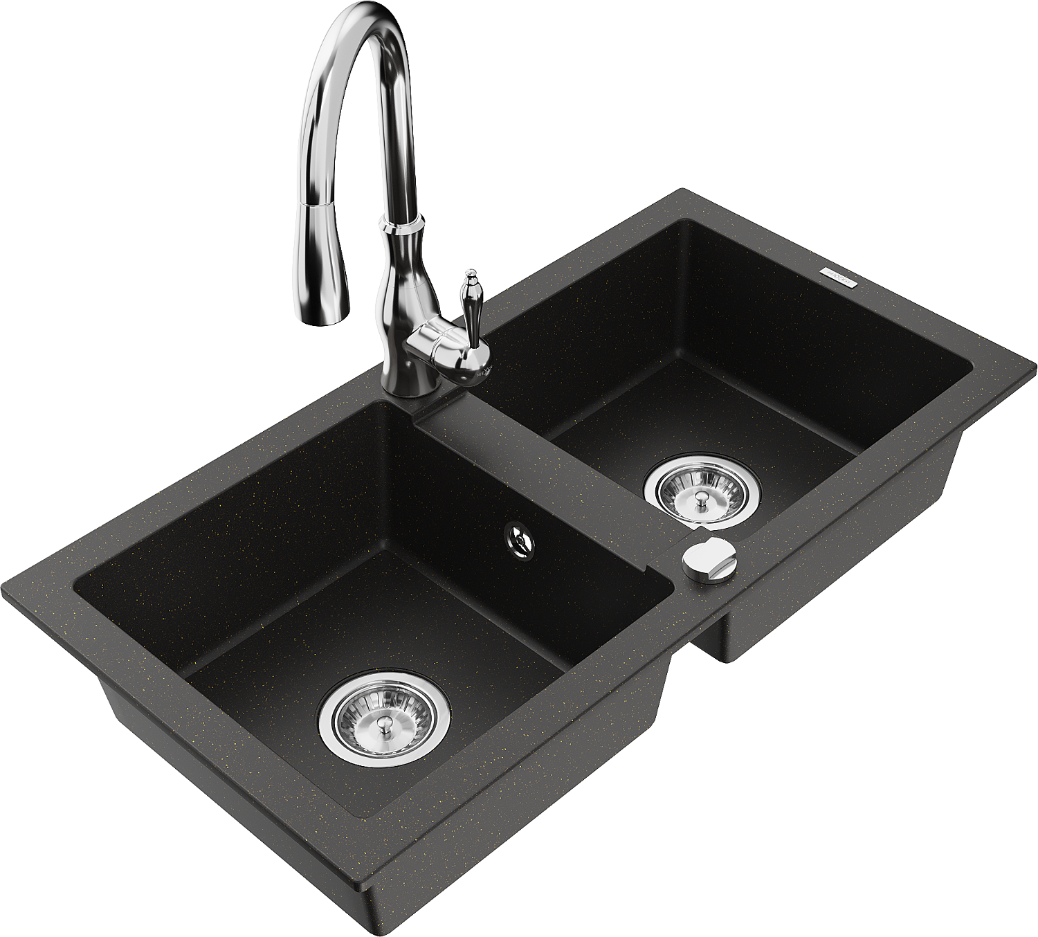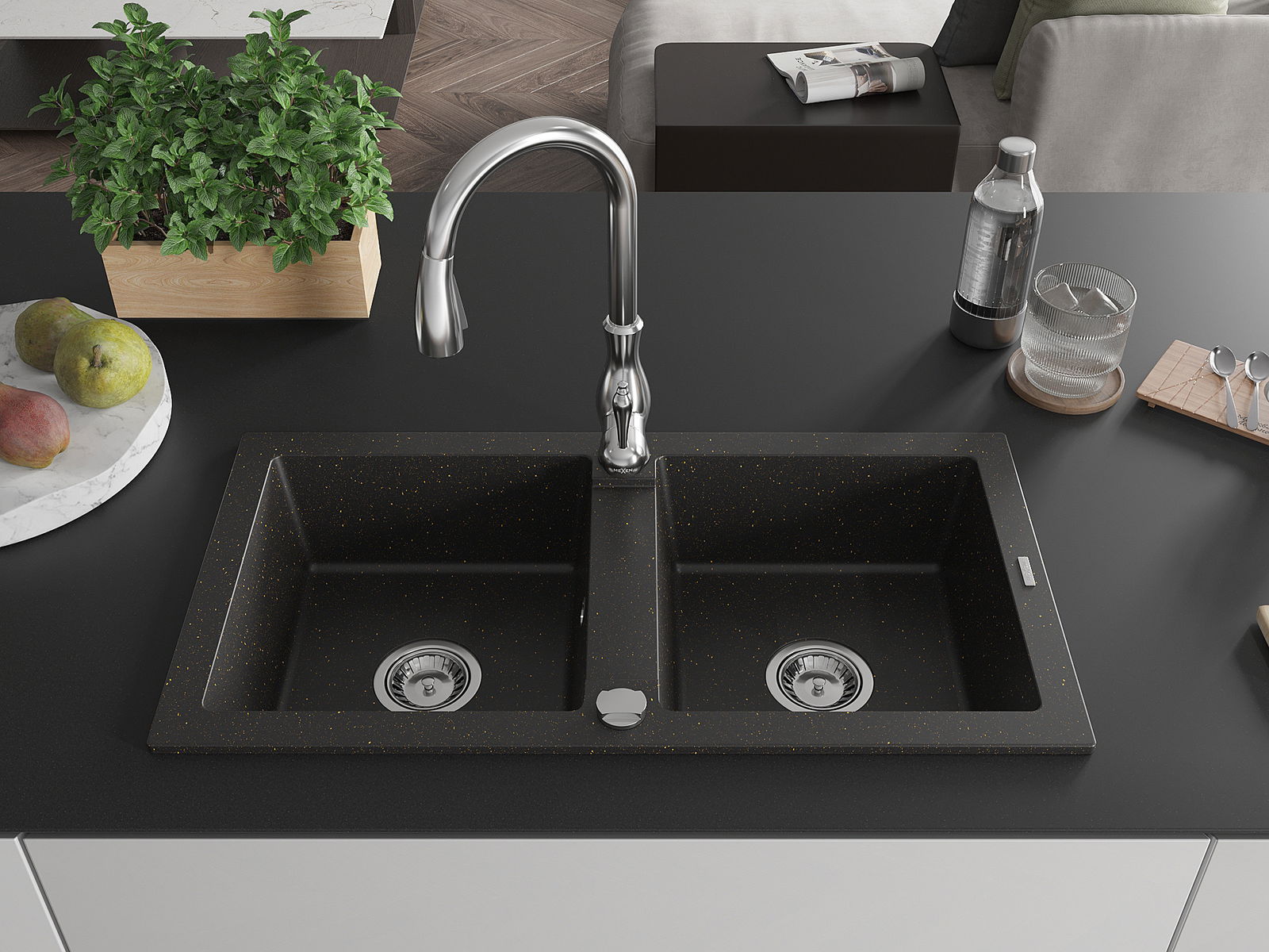 Mexen Mario zlewozmywak granitowy 2-komorowy z baterią kuchenną Savita, czarny/złoty metalik - 6504-75-672601-00