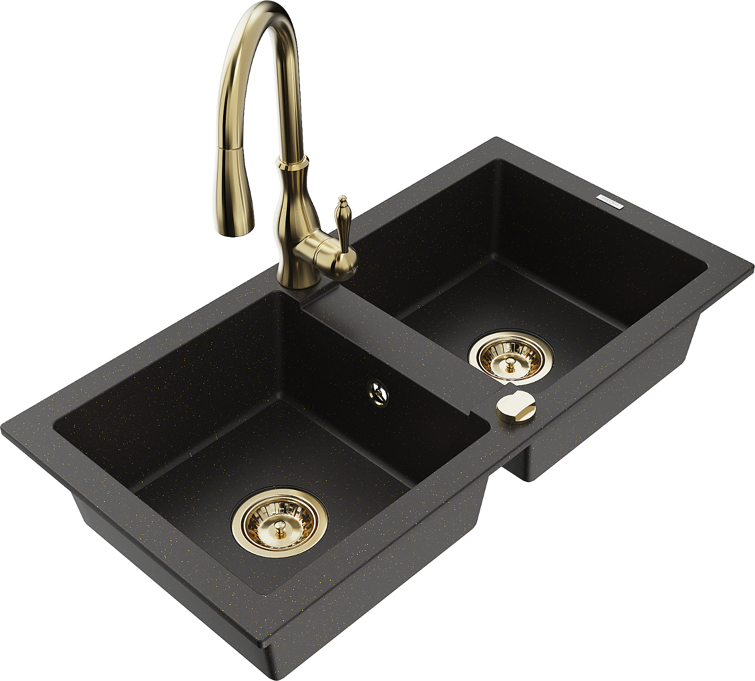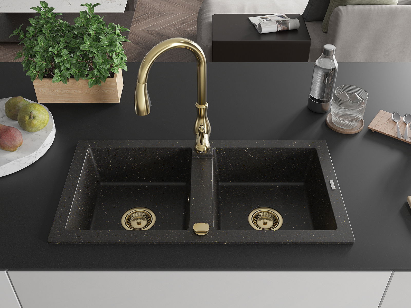 Mexen Mario zlewozmywak granitowy 2-komorowy z baterią kuchenną Savita, czarny/złoty metalik - 6504-75-672601-50