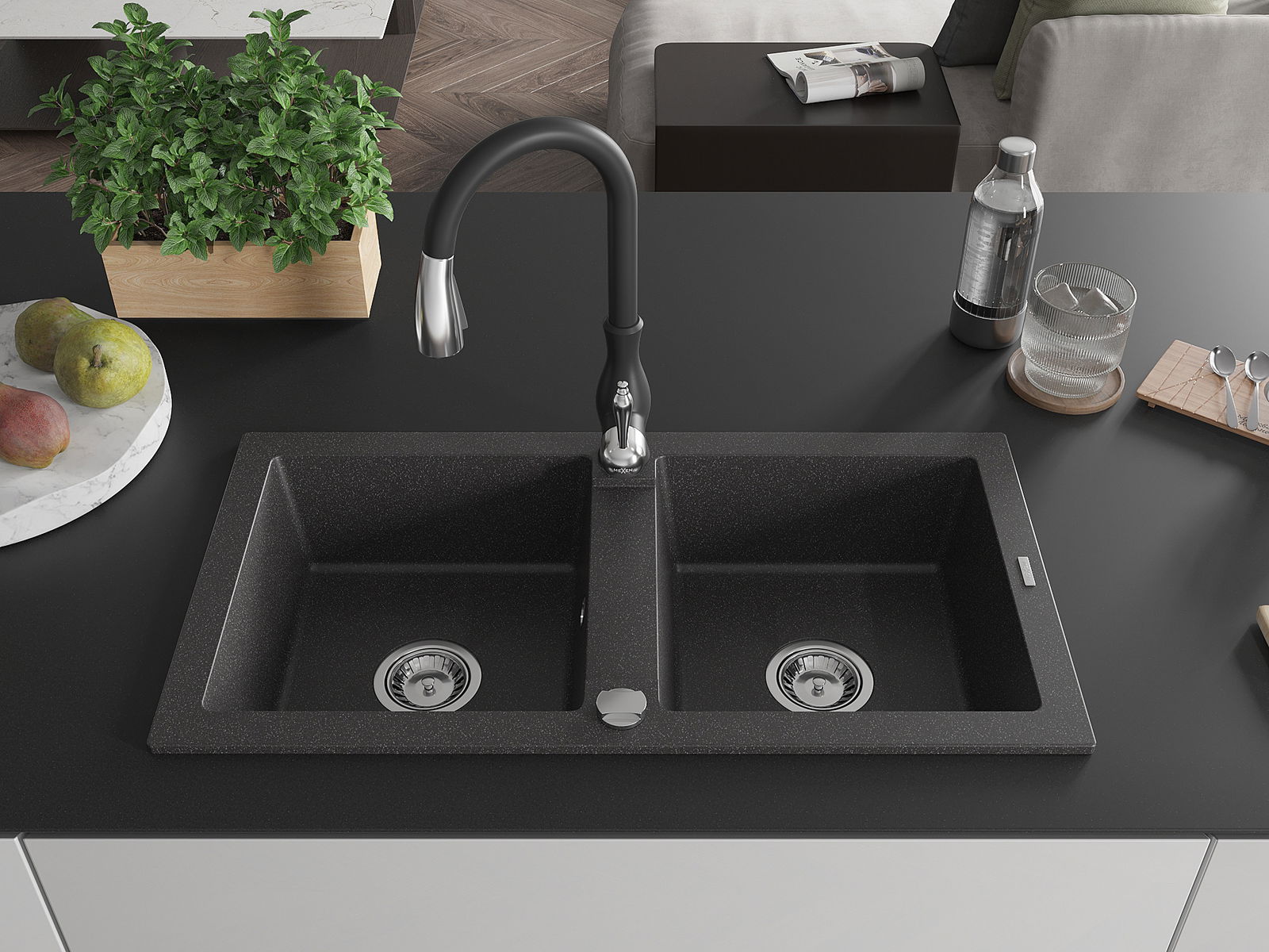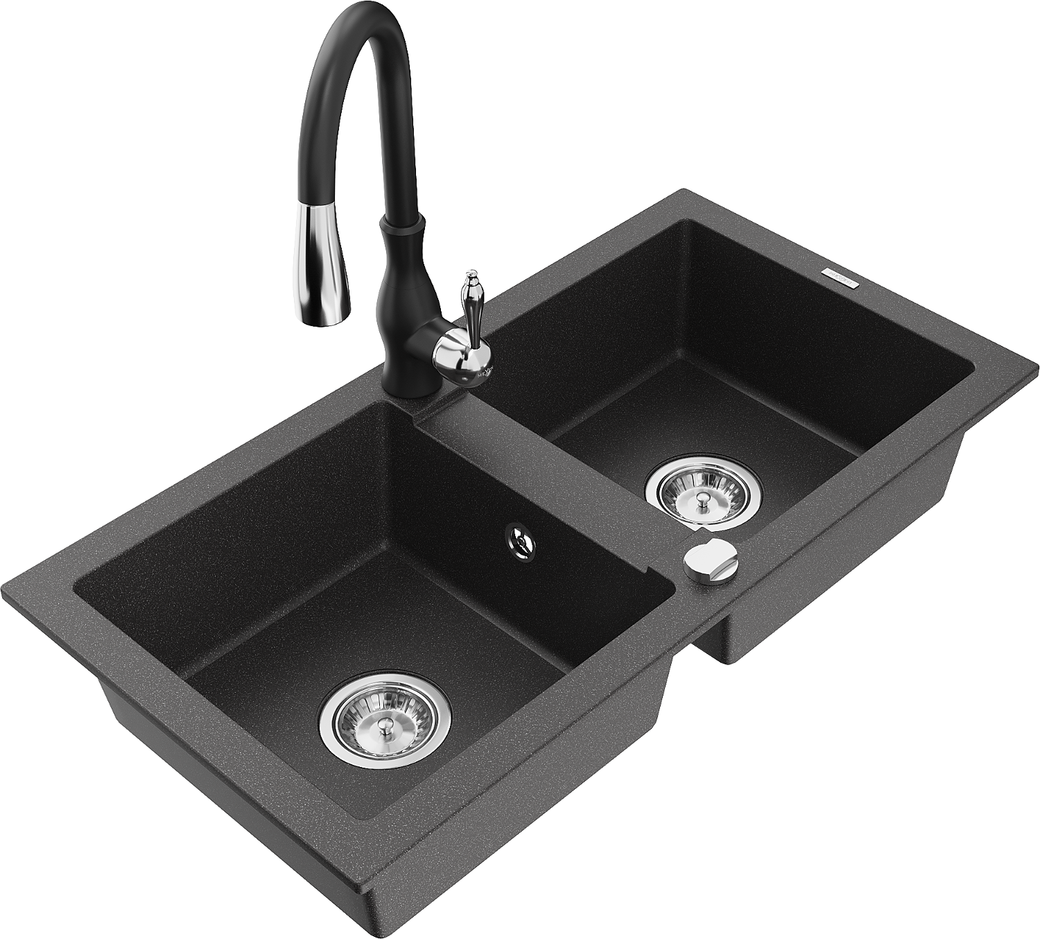 Mexen Mario zlewozmywak granitowy 2-komorowy z baterią kuchenną Savita, czarny nakrapiany - 6504-76-672601-70