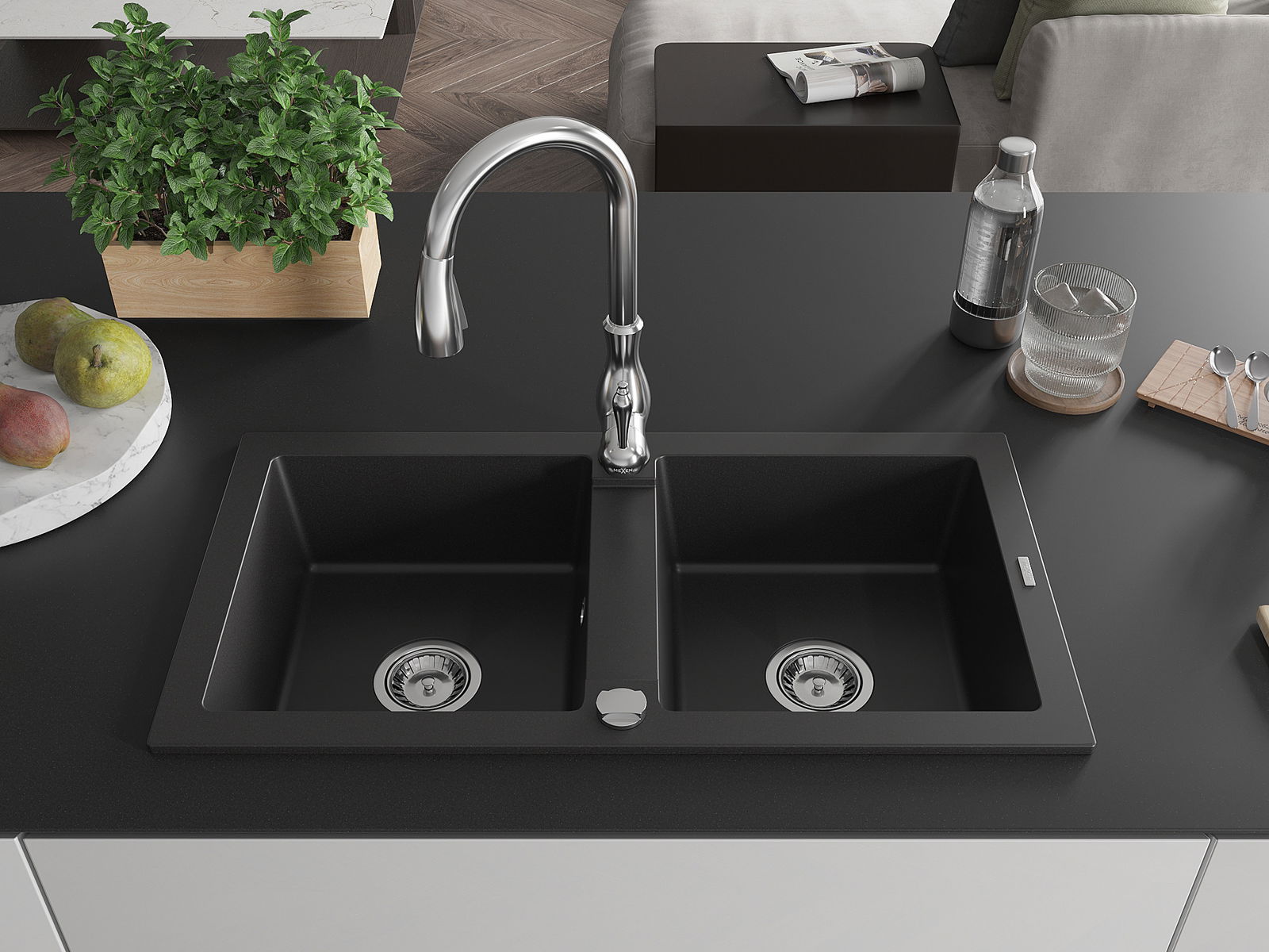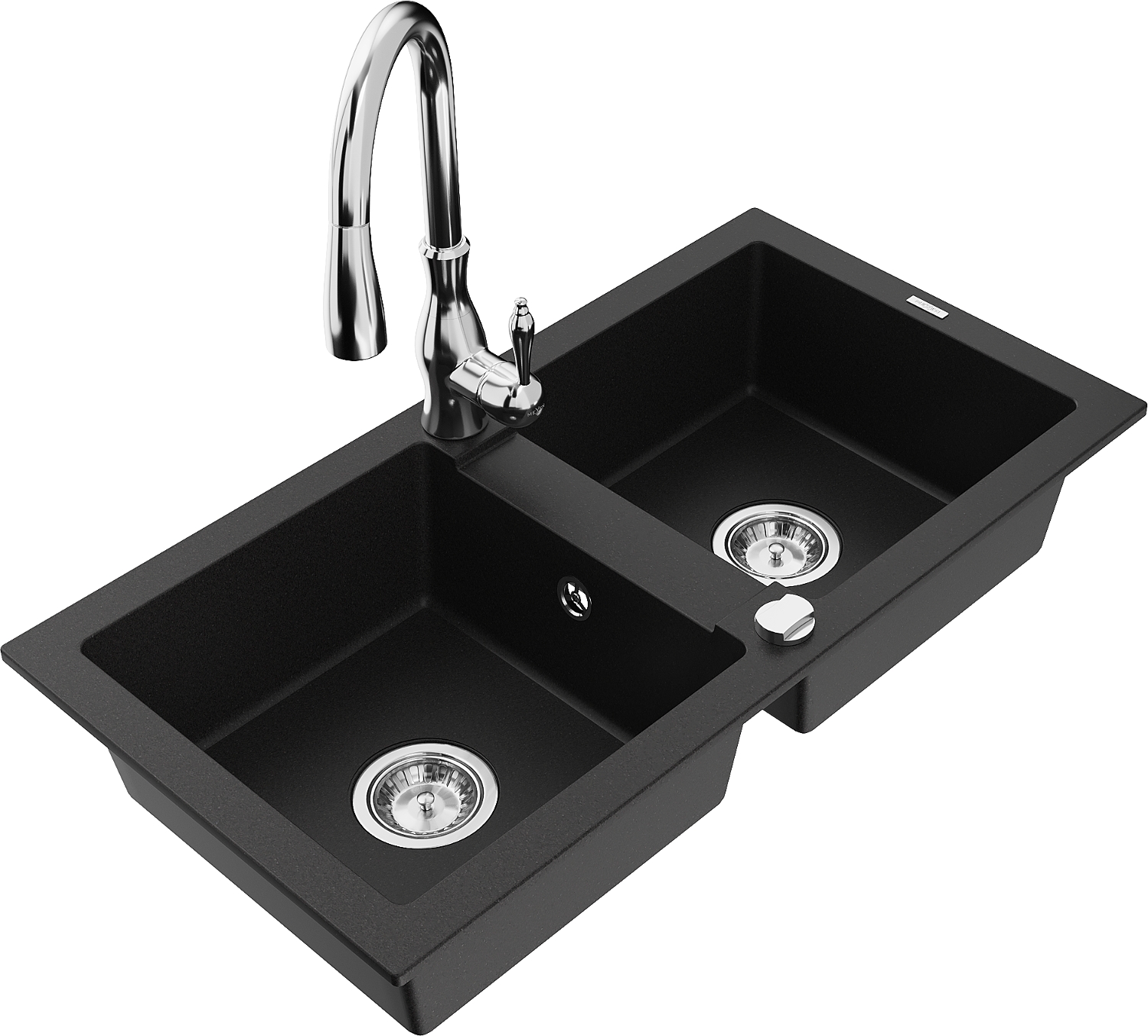 Mexen Mario zlewozmywak granitowy 2-komorowy z baterią kuchenną Savita, czarny - 6504-77-672601-00