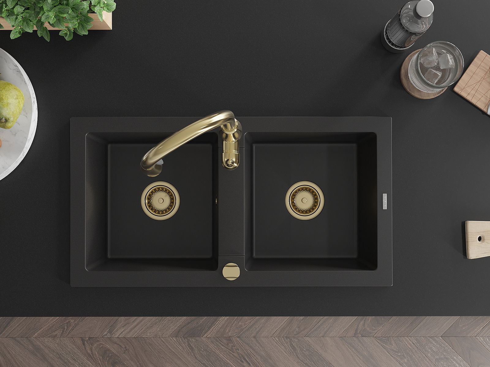 Mexen Mario zlewozmywak granitowy 2-komorowy z baterią kuchenną Savita, czarny - 6504-77-672601-50