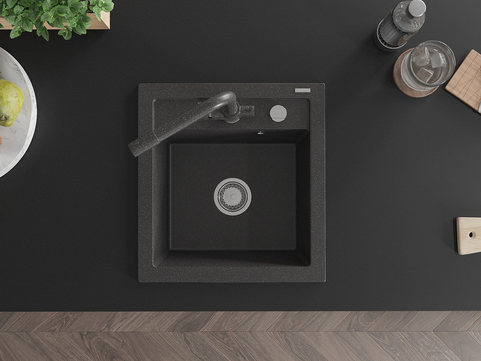 Zlew posiada podfrezowany otwór o średnicy 35 mm do samodzielnego wybicia. Można go wykorzystać m.in. do montażu dozownika na płyn, który wyeliminuje obecność plastikowych butelek w kuchni i nada jej eleganckiego wykończenia.