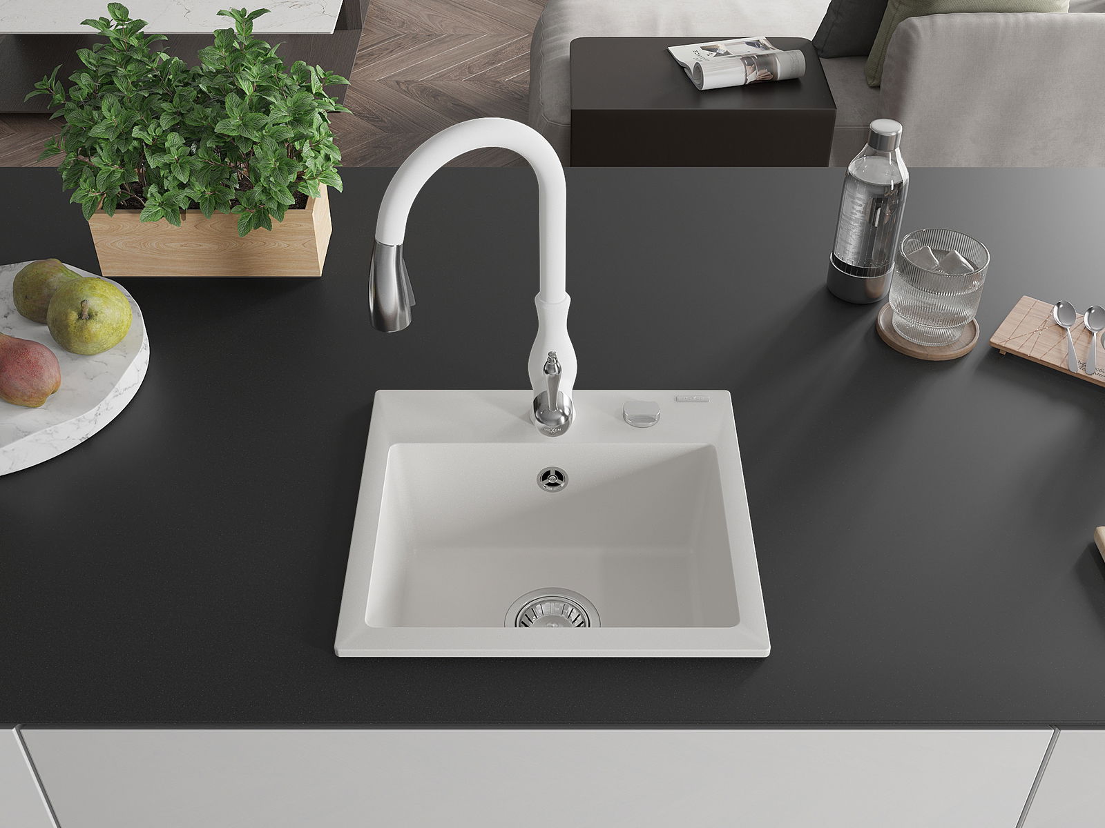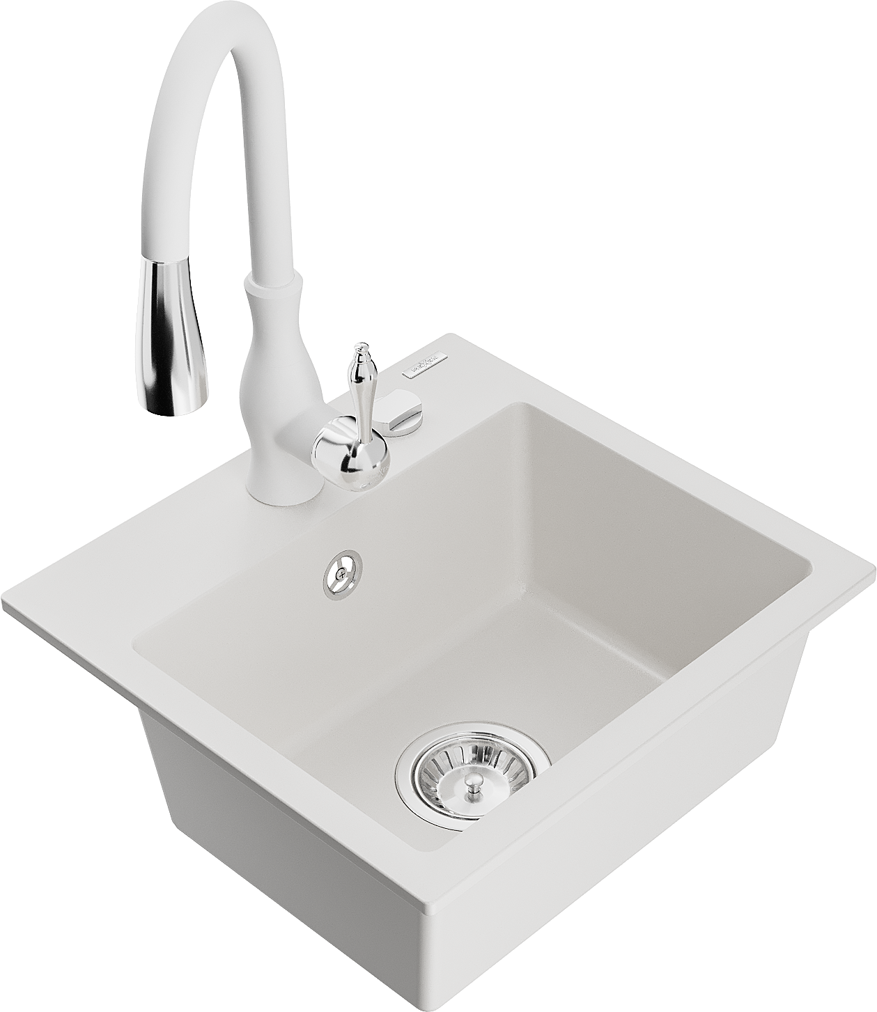 Mexen Milo zlewozmywak granitowy 1-komorowy z baterią kuchenną Savita, biały - 6505-20-672601-20