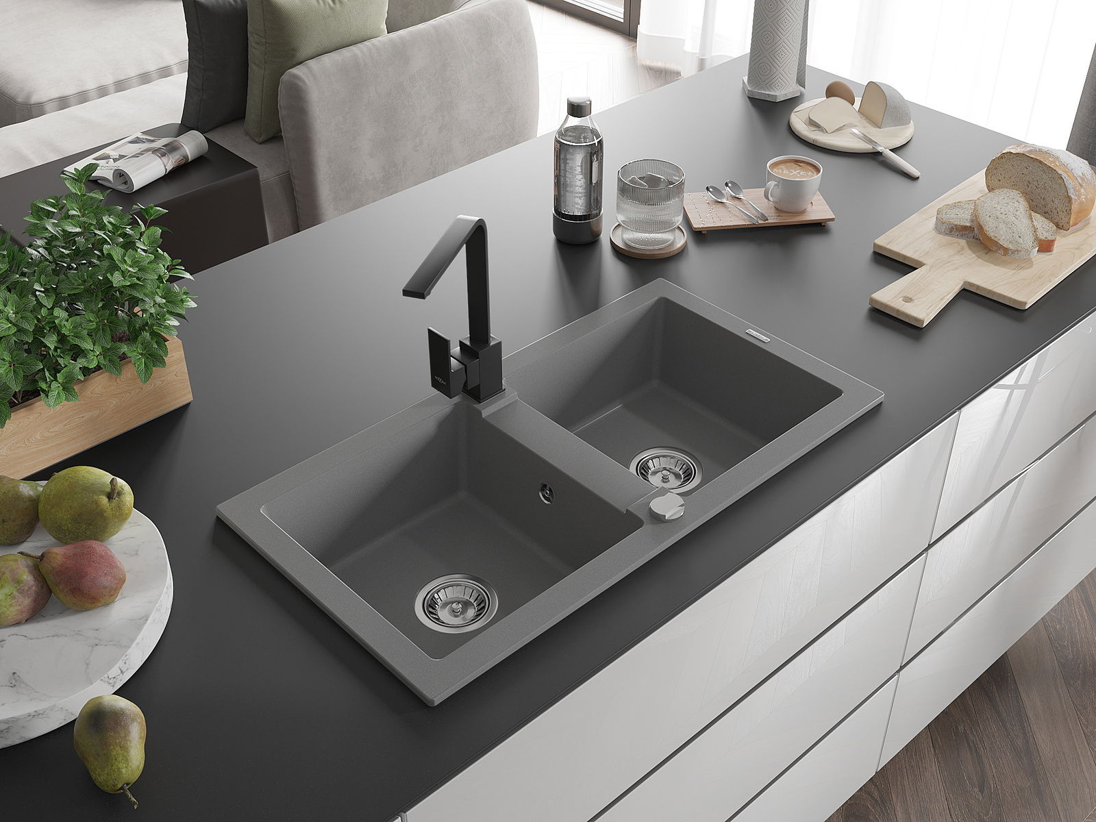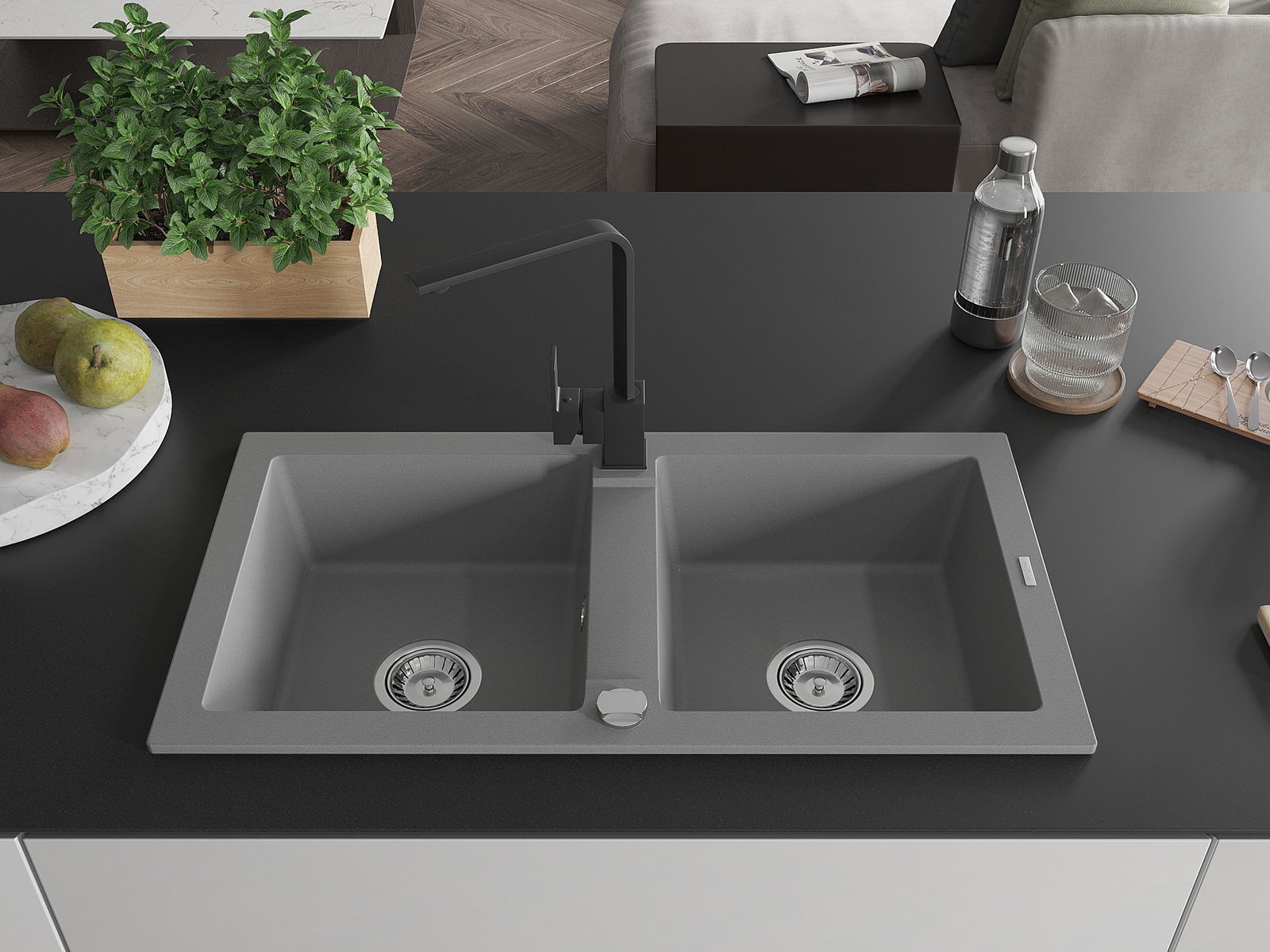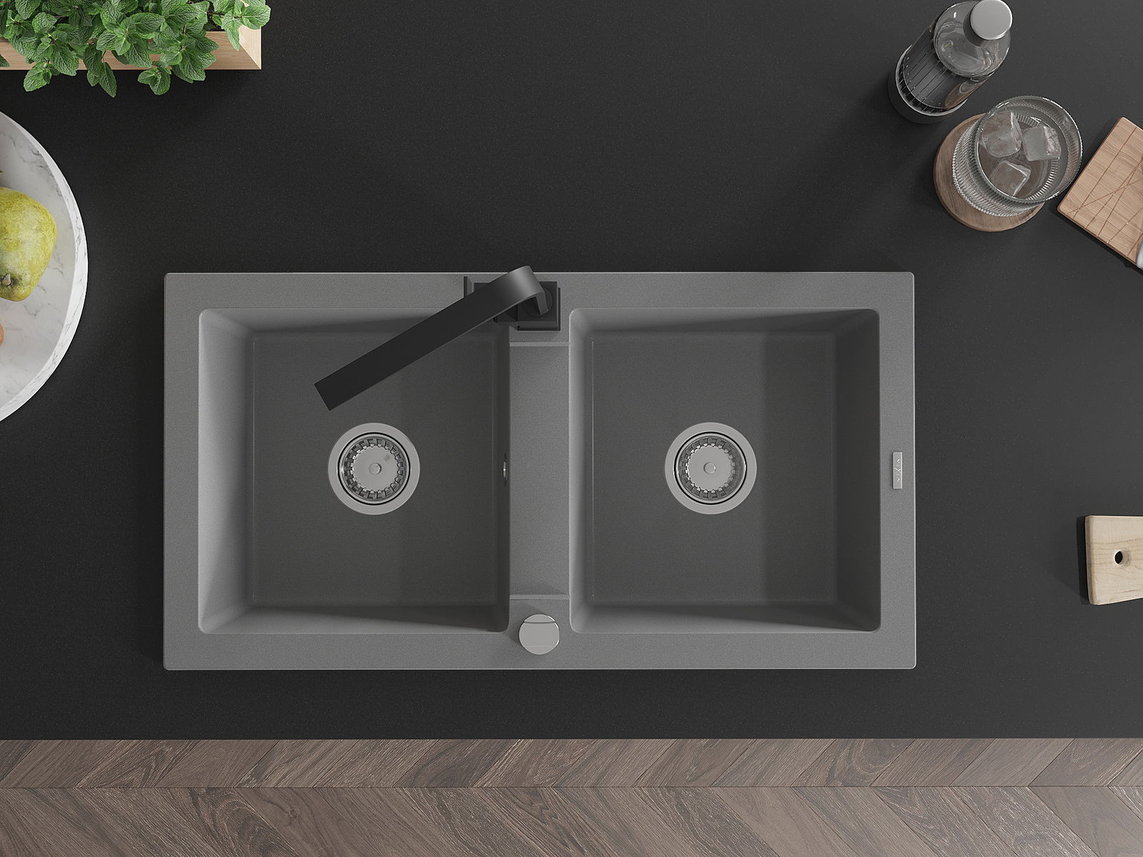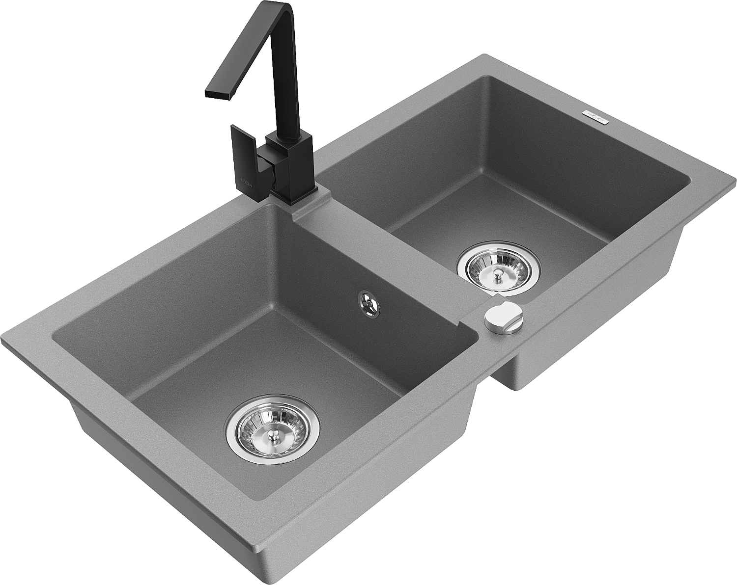 Mexen Mario zlewozmywak granitowy 2-komorowy z baterią kuchenną Rita, szary - 6504-71-670300-70