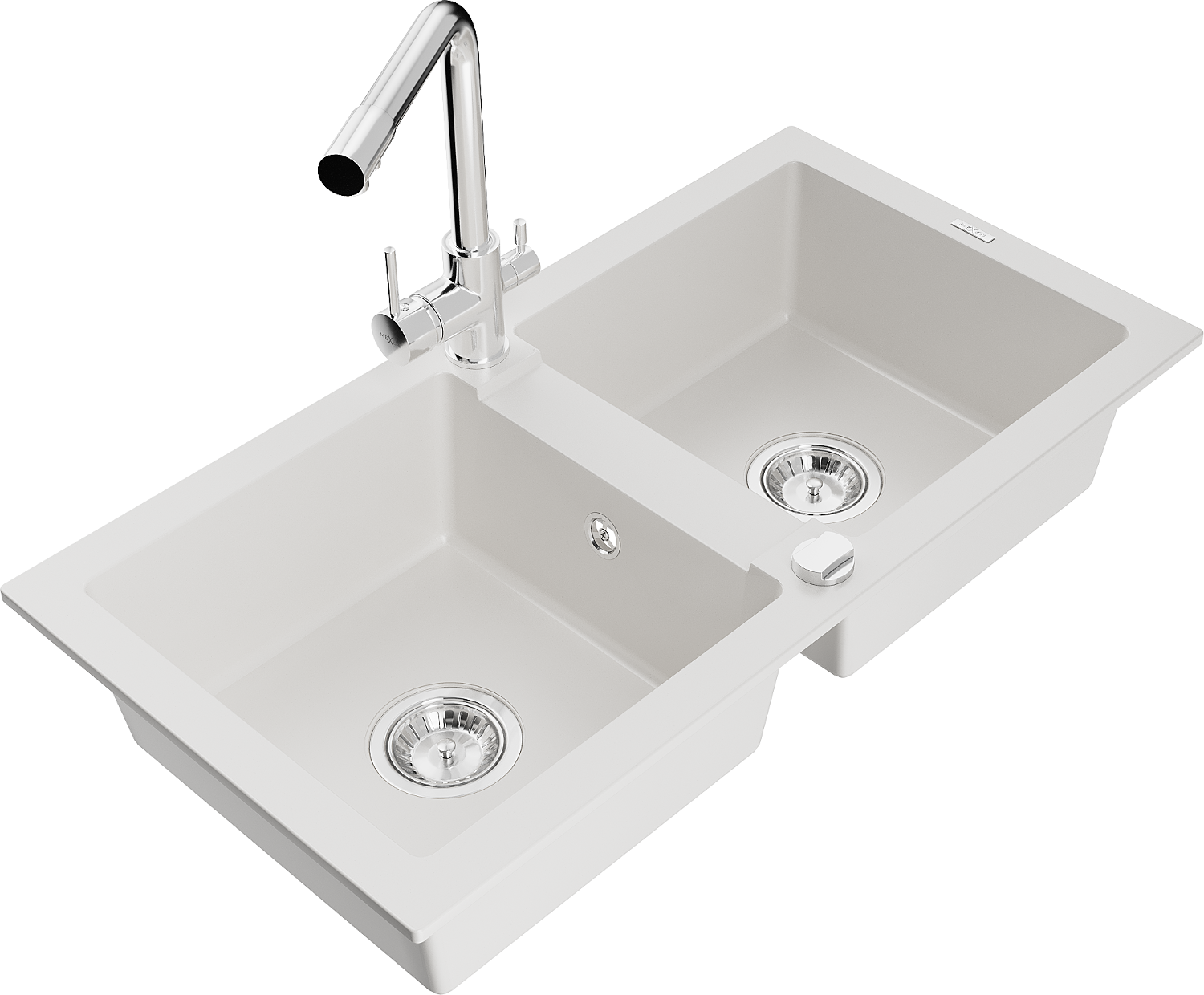 Mexen Mario zlewozmywak granitowy 2-komorowy z baterią kuchenną Duero, biały - 6504-20-671600-00
