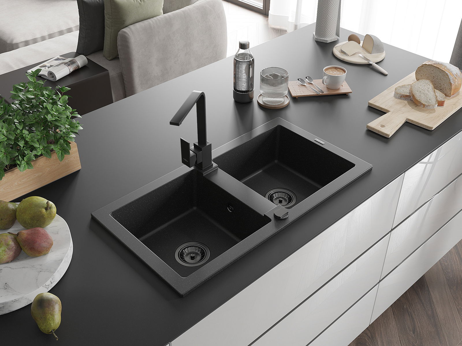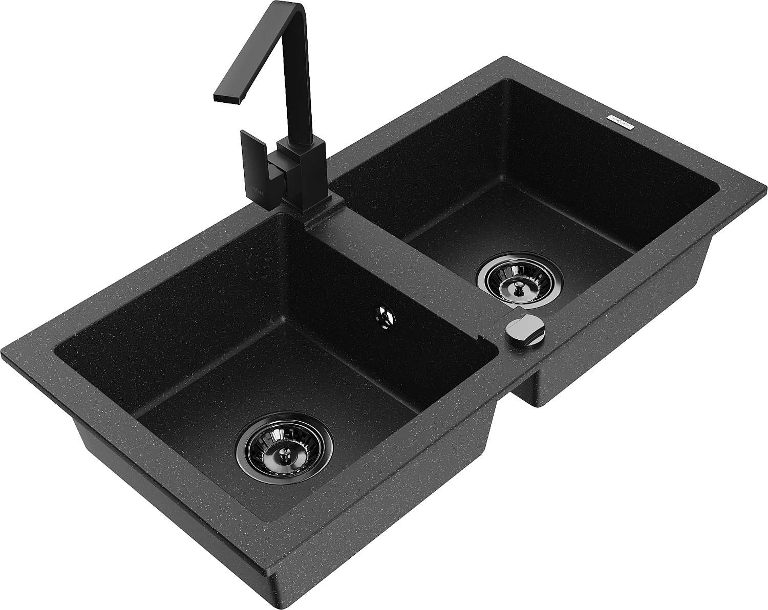 Mexen Mario zlewozmywak granitowy 2-komorowy z baterią kuchenną Rita, czarny/srebrny metalik - 6504-73-670300-70-B