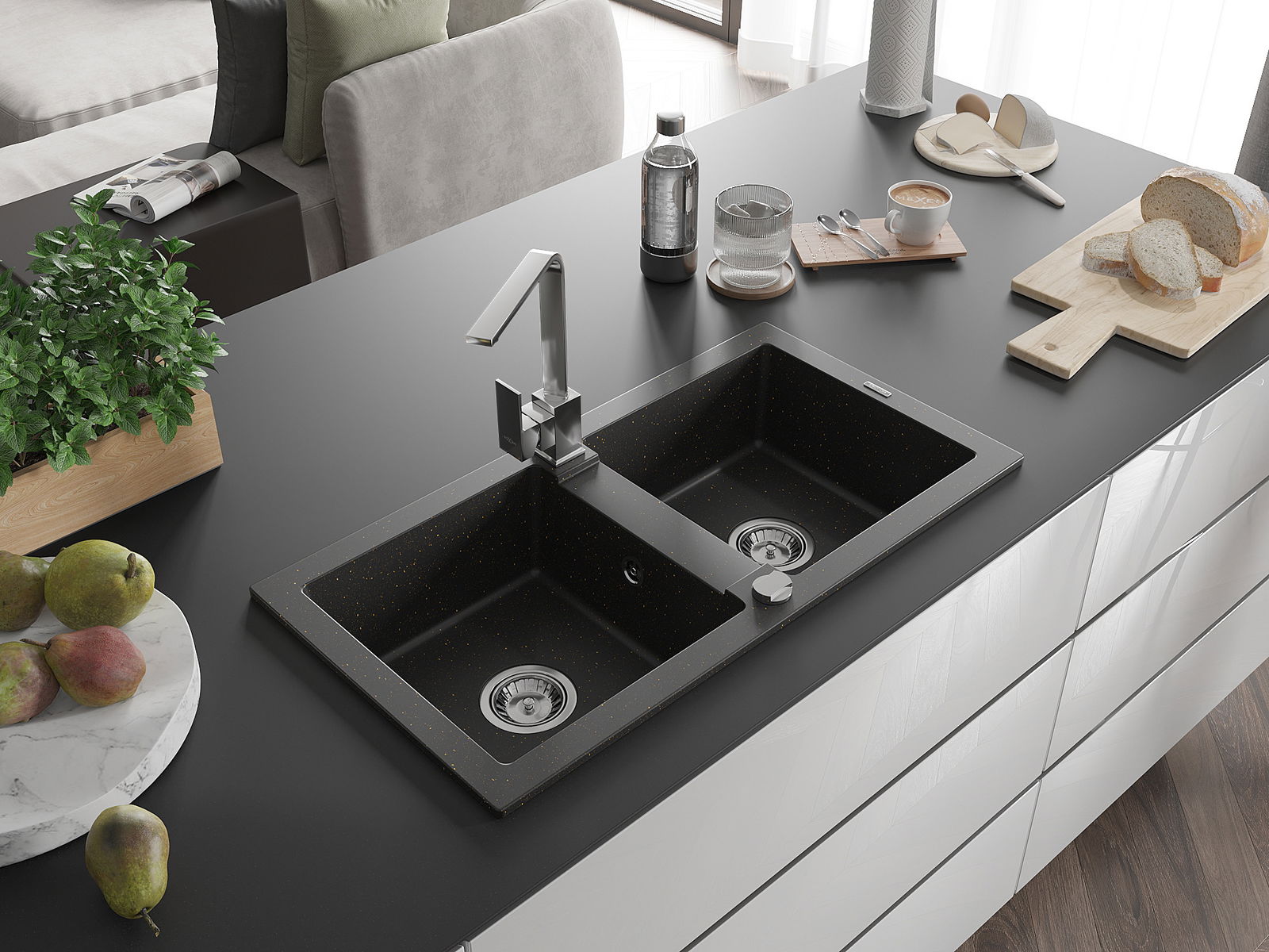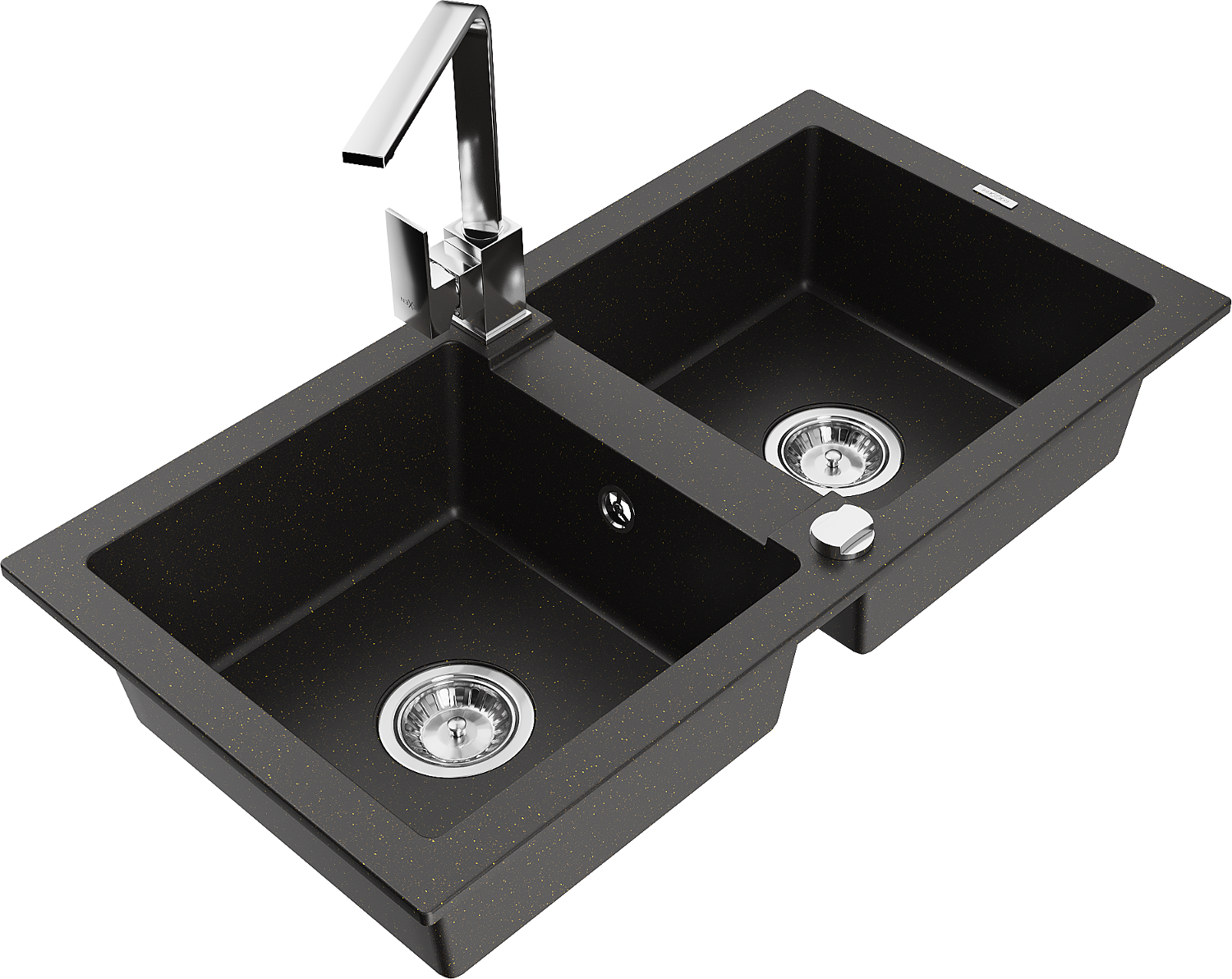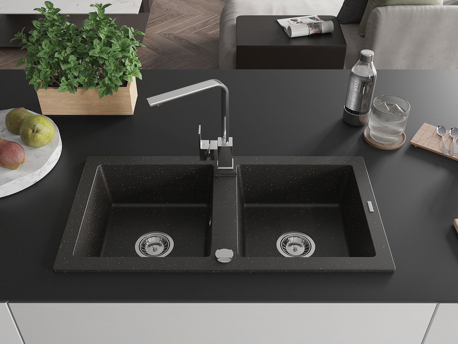 Mexen Mario zlewozmywak granitowy 2-komorowy z baterią kuchenną Rita, czarny/złoty metalik - 6504-75-670300-00