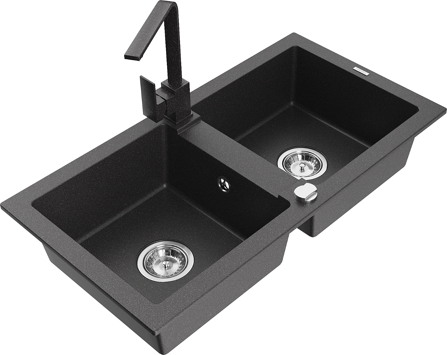 Mexen Mario zlewozmywak granitowy 2-komorowy z baterią kuchenną Rita, czarny nakrapiany - 6504-76-670300-76