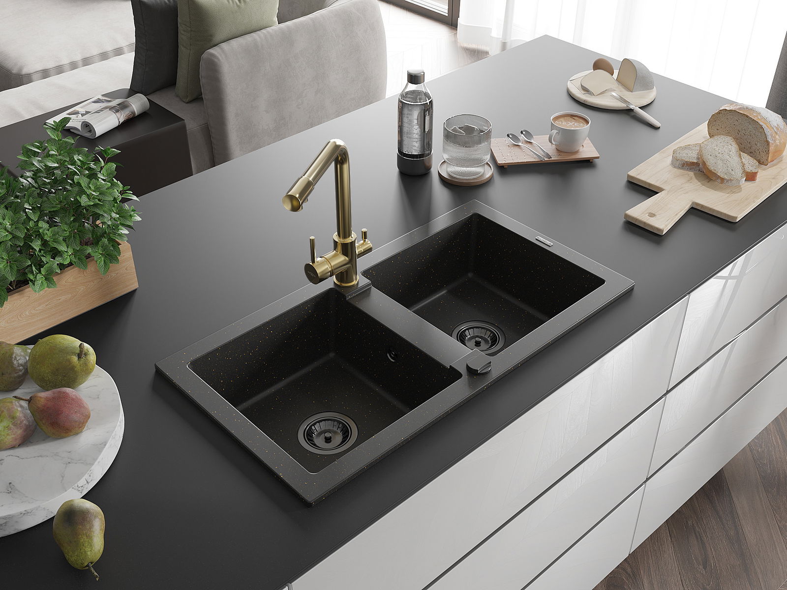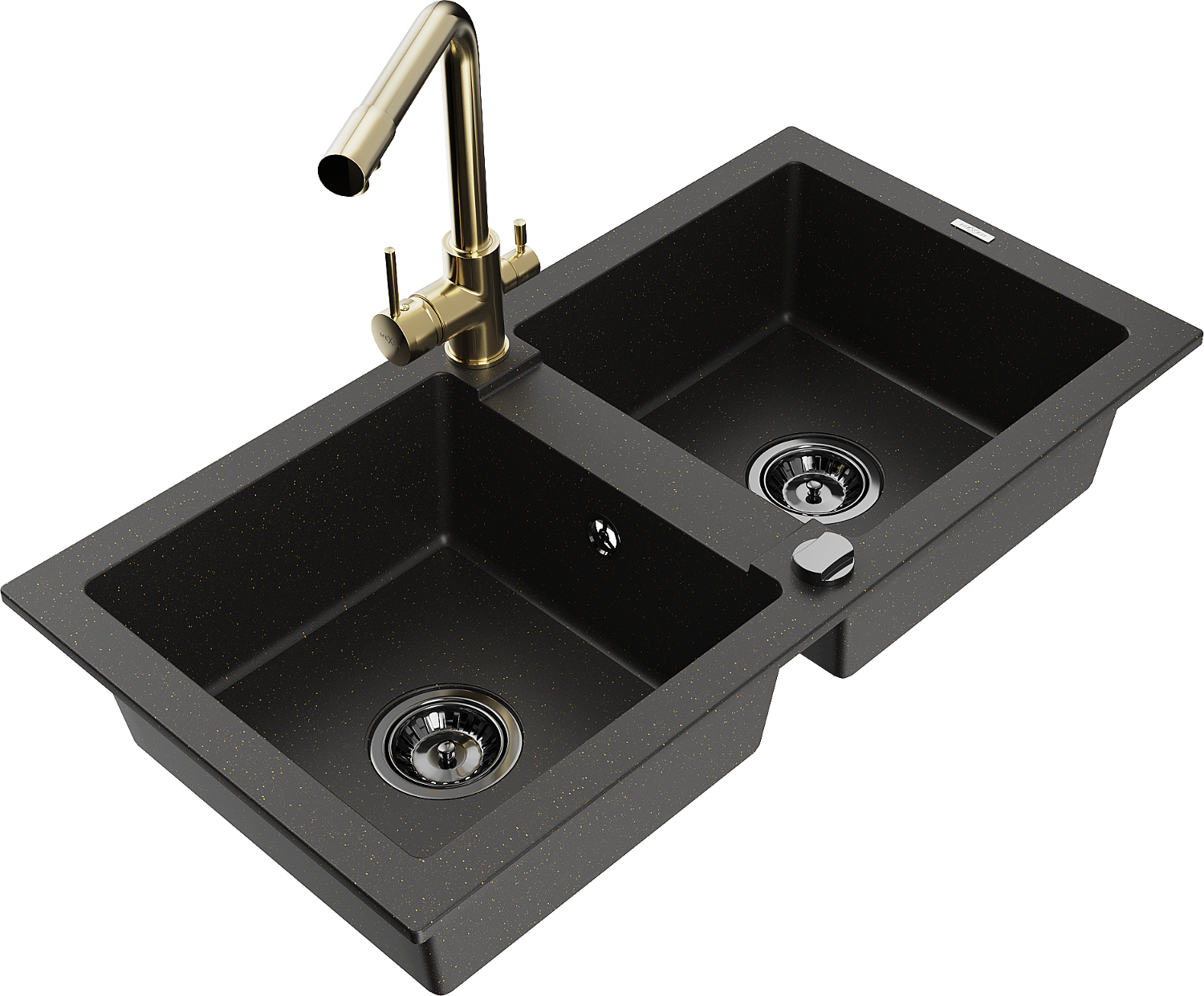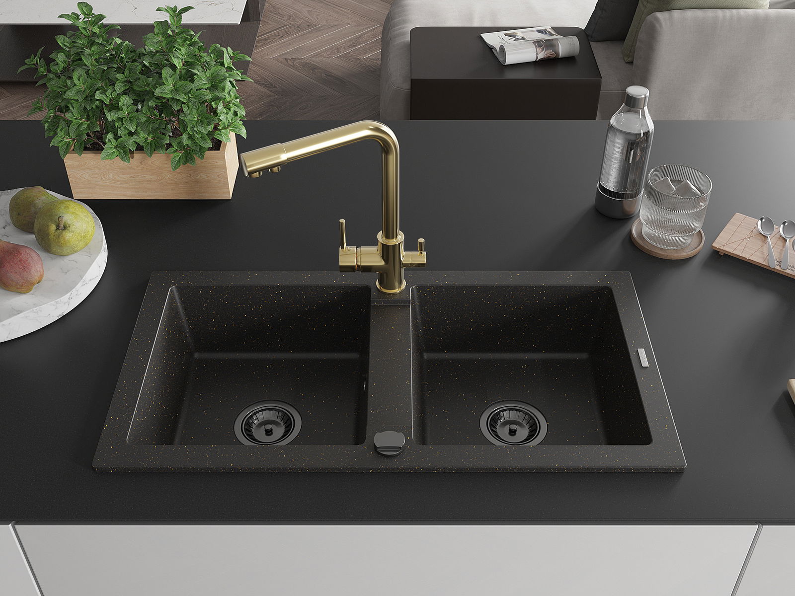 Mexen Mario zlewozmywak granitowy 2-komorowy z baterią kuchenną Duero, czarny/złoty metalik - 6504-75-671600-50-B