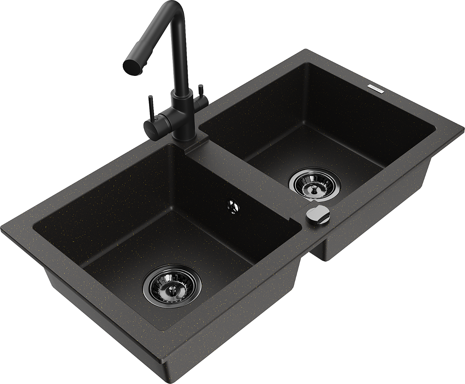 Mexen Mario zlewozmywak granitowy 2-komorowy z baterią kuchenną Duero, czarny/złoty metalik - 6504-75-671600-70-B