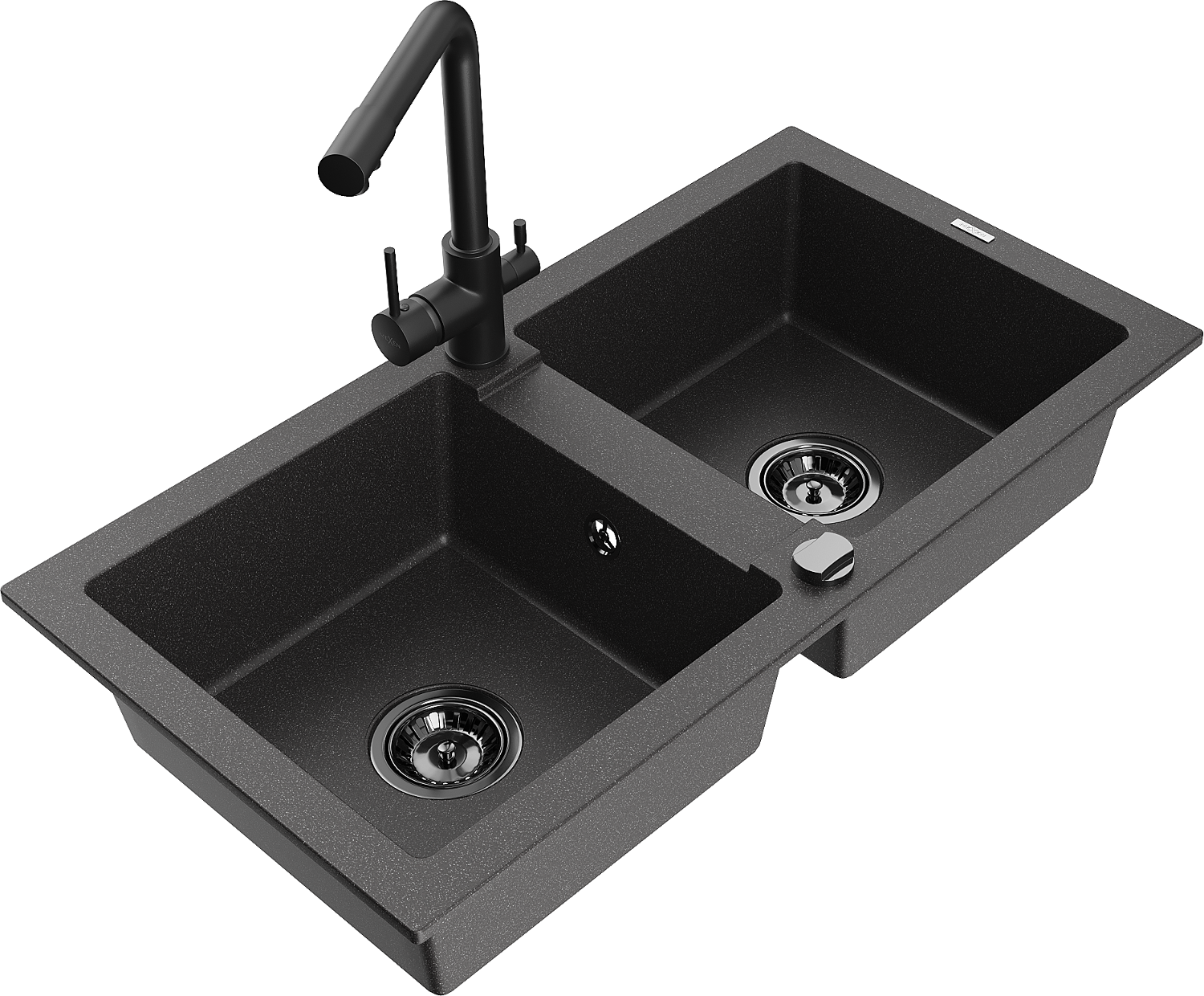 Mexen Mario zlewozmywak granitowy 2-komorowy z baterią kuchenną Duero, czarny nakrapiany - 6504-76-671600-70-B