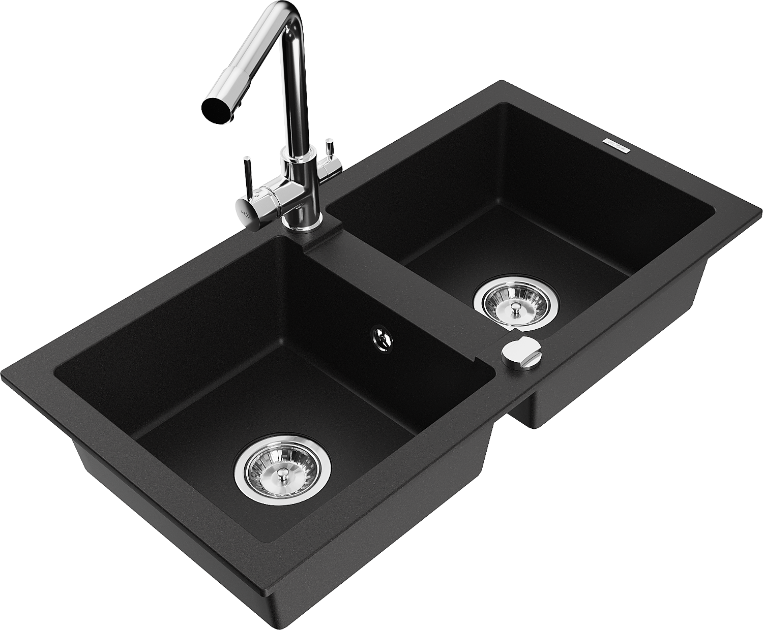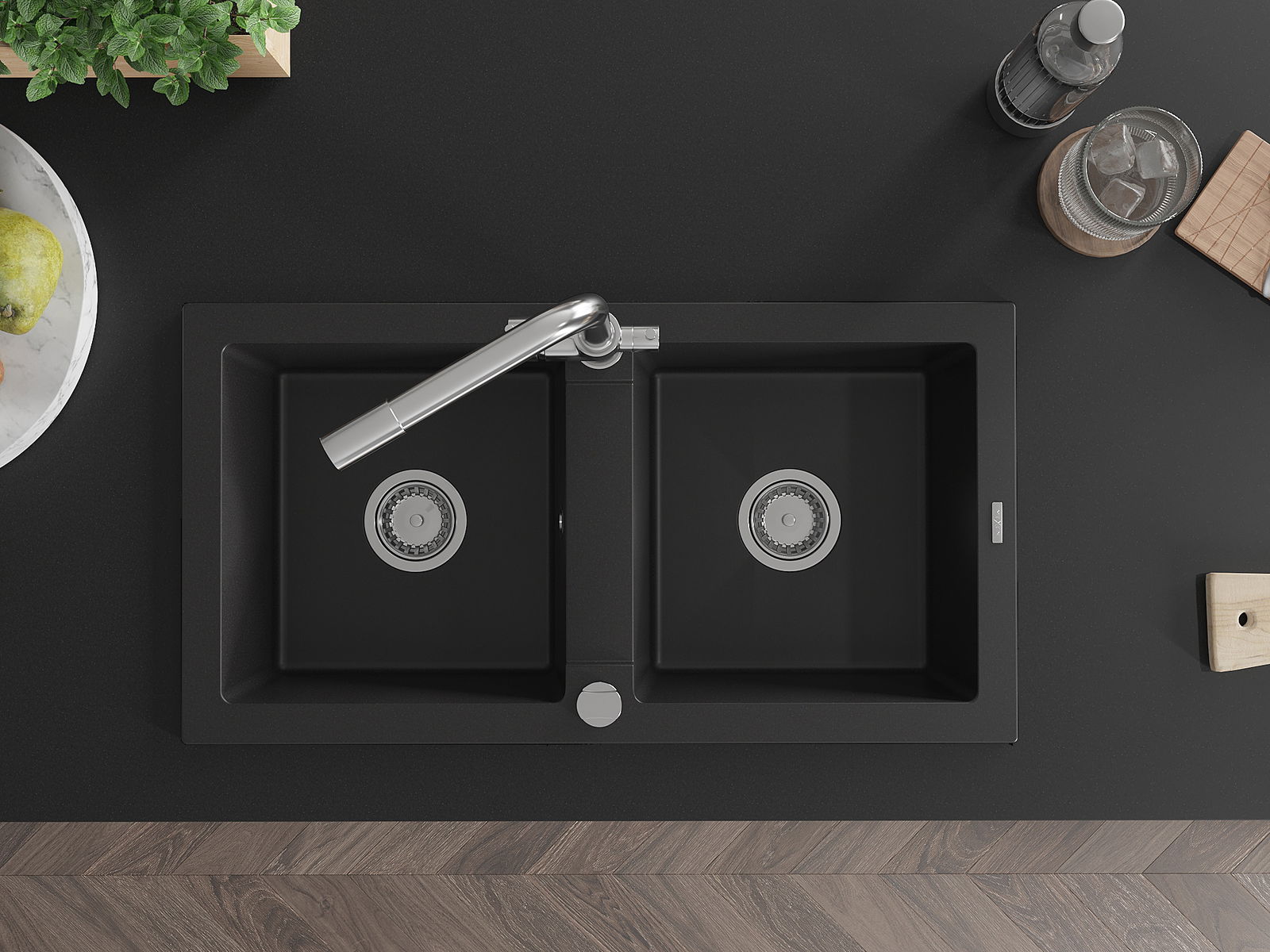 Mexen Mario zlewozmywak granitowy 2-komorowy z baterią kuchenną Duero, czarny - 6504-77-671600-00