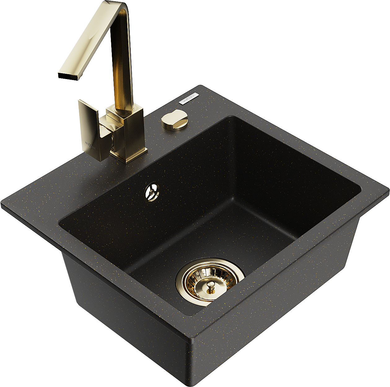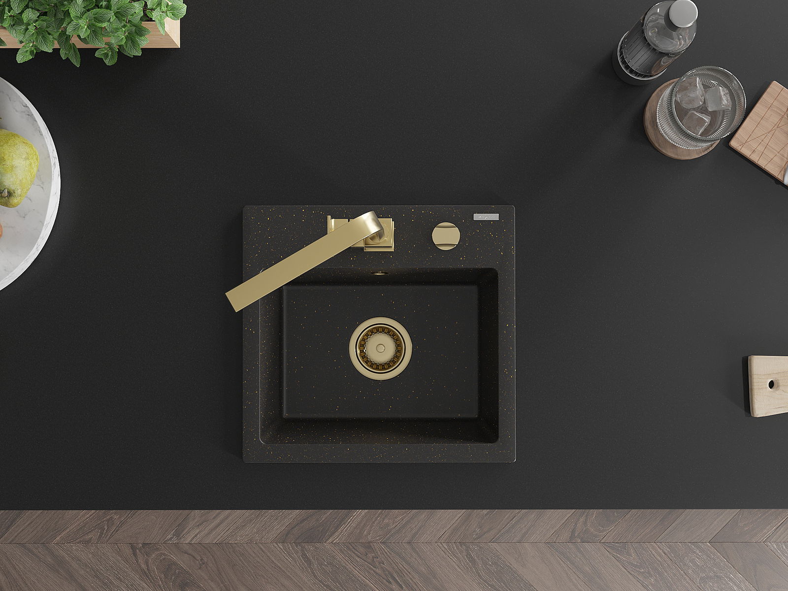 Mexen Milo zlewozmywak granitowy 1-komorowy z baterią kuchenną Rita, czarny/złoty metalik - 6505-75-670300-50