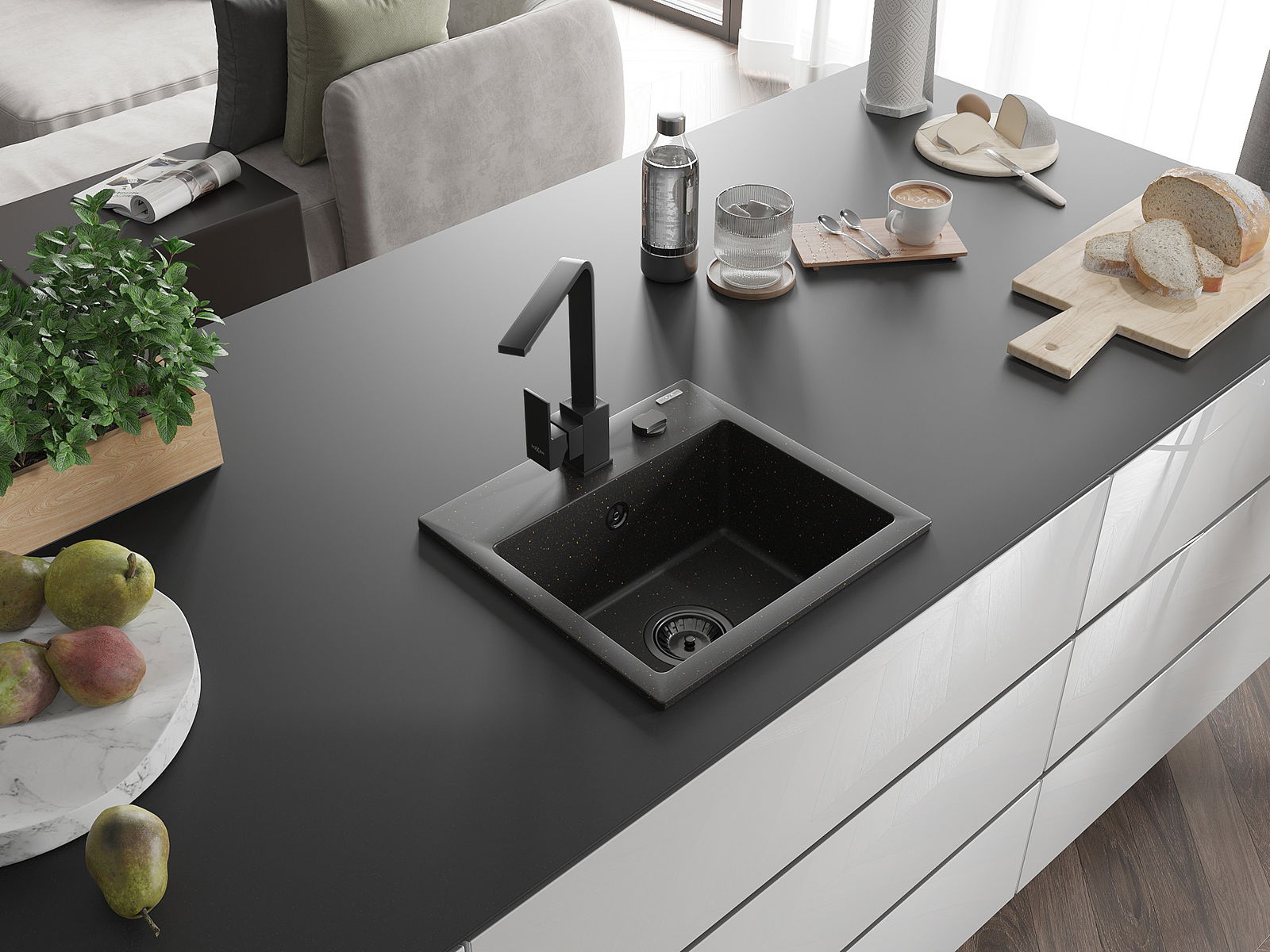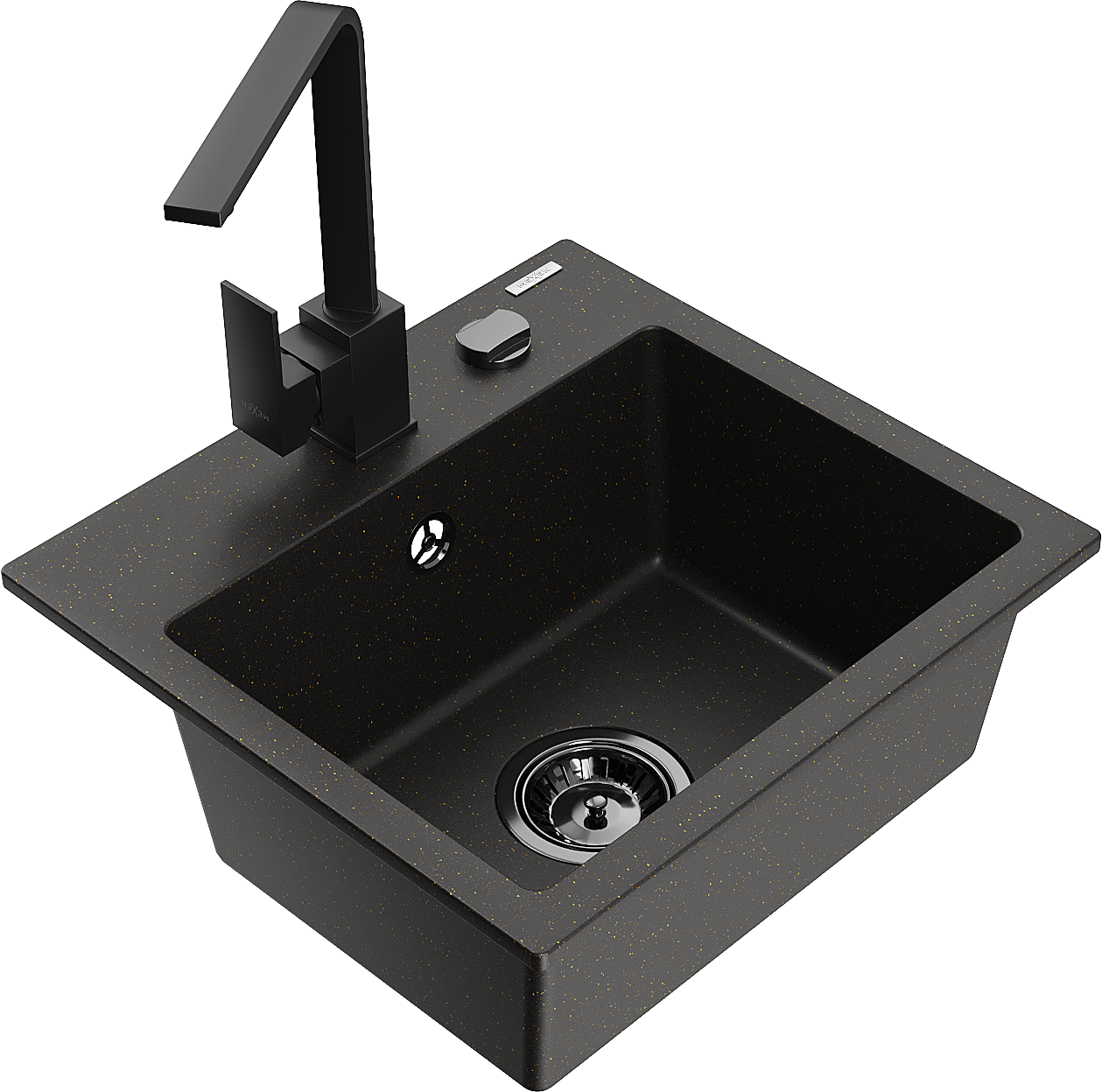 Mexen Milo zlewozmywak granitowy 1-komorowy z baterią kuchenną Rita, czarny/złoty metalik - 6505-75-670300-70-B