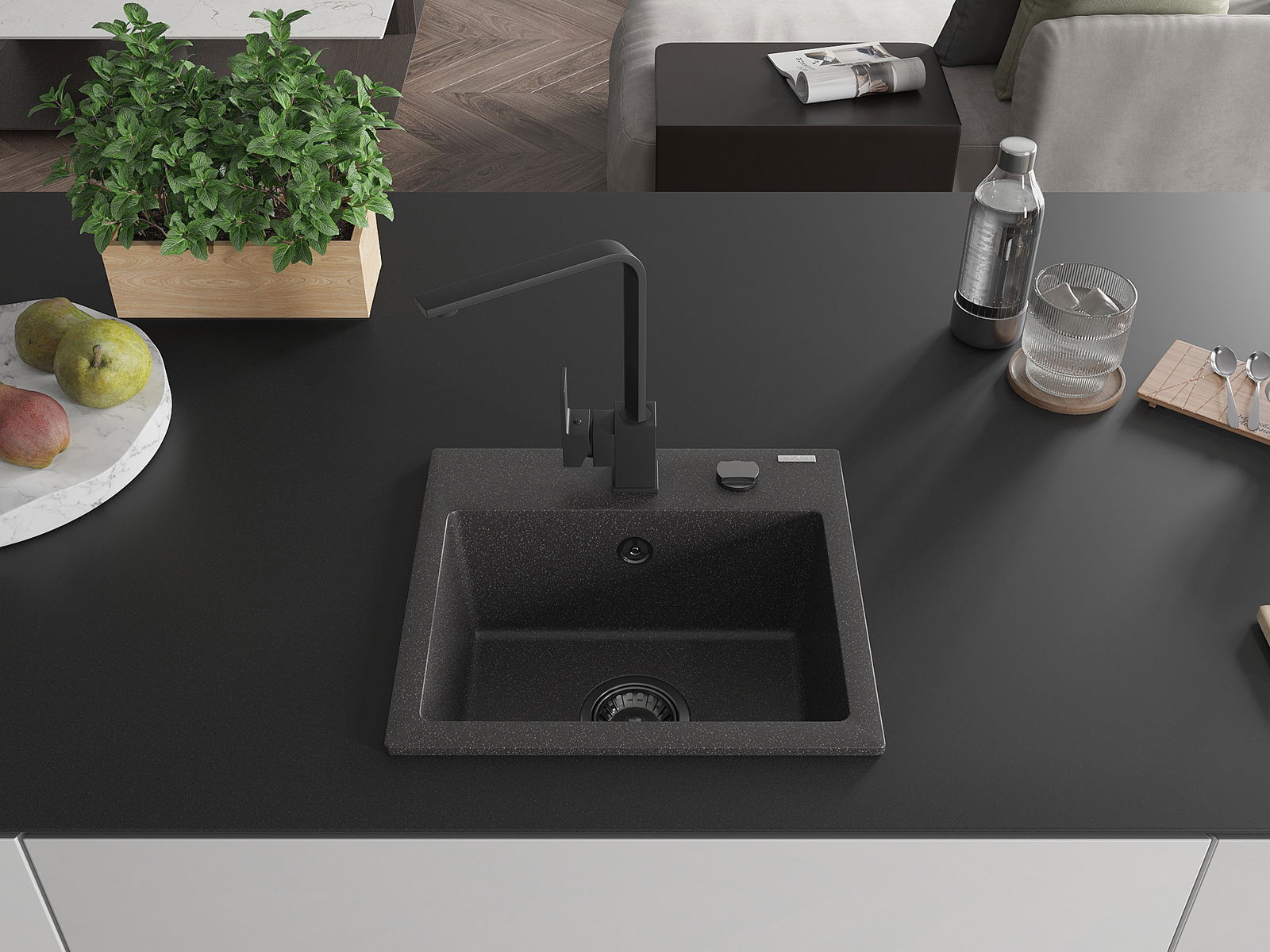 Zlew posiada podfrezowany otwór o średnicy 35 mm do samodzielnego wybicia. Można go wykorzystać m.in. do montażu dozownika na płyn, który wyeliminuje obecność plastikowych butelek w kuchni i nada jej eleganckiego wykończenia.