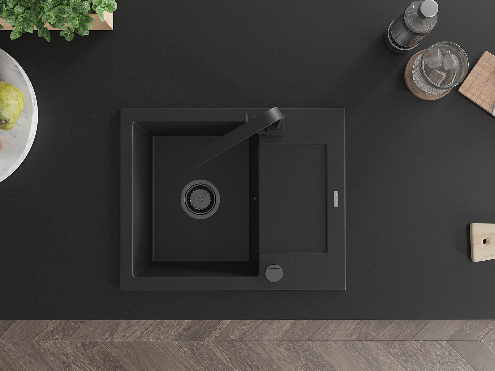 Mexen Enzo zlewozmywak granitowy 1-komorowy z ociekaczem i baterią kuchenną Rita, czarny - 6506-77-670300-70-B
