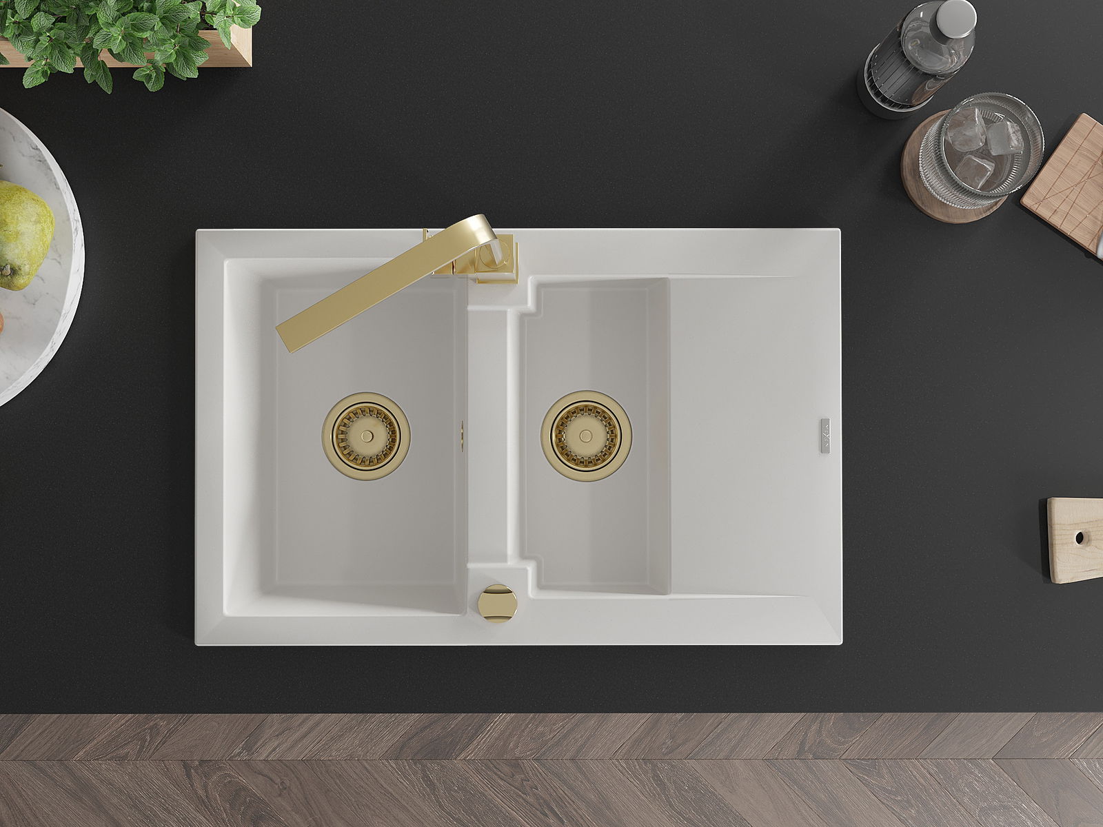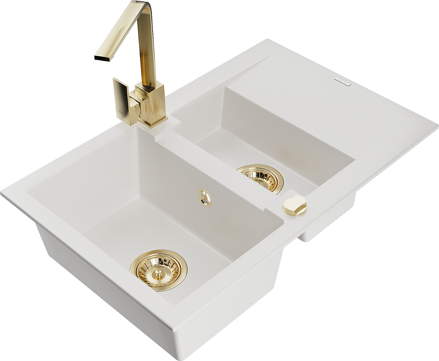 Mexen Gaspar zlewozmywak granitowy 1,5-komorowy z ociekaczem i baterią kuchenną Rita, biały - 6507-20-670300-50