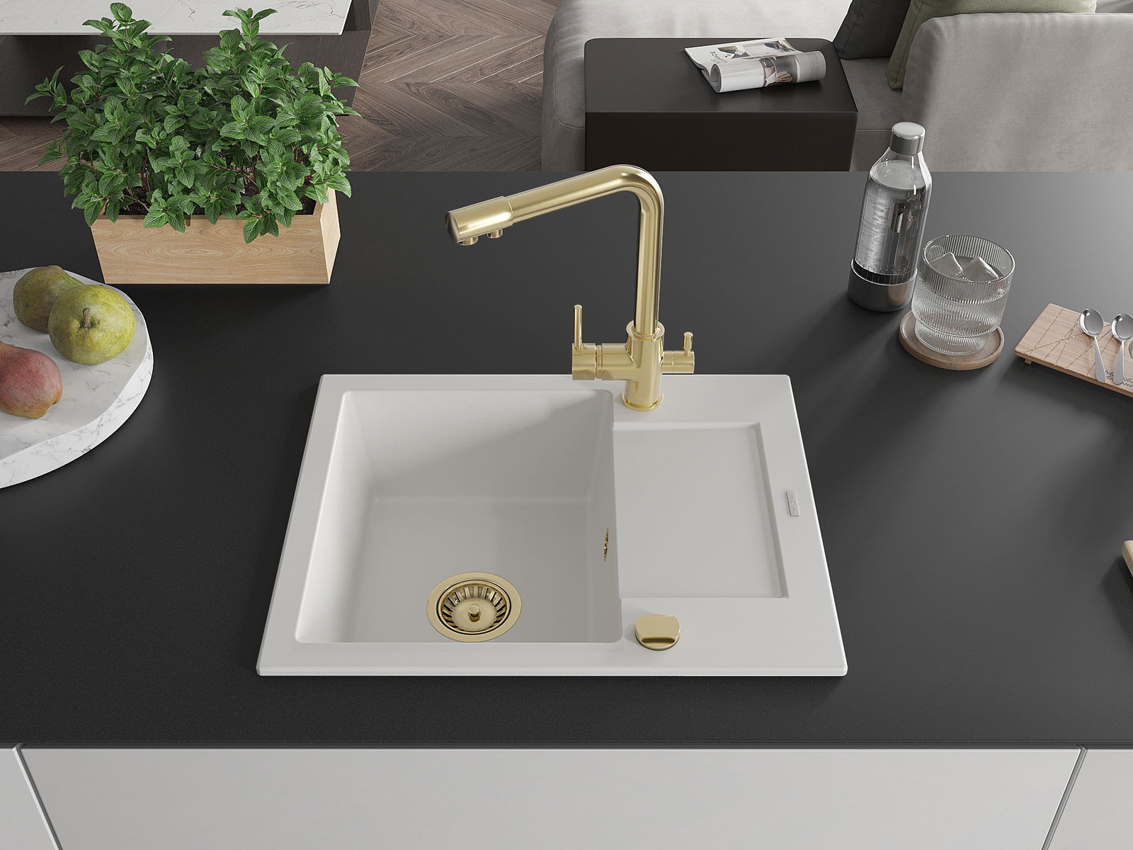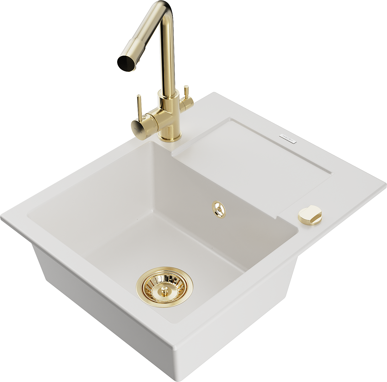 Mexen Enzo zlewozmywak granitowy 1-komorowy z ociekaczem i baterią kuchenną Duero, biały - 6506-20-671600-50