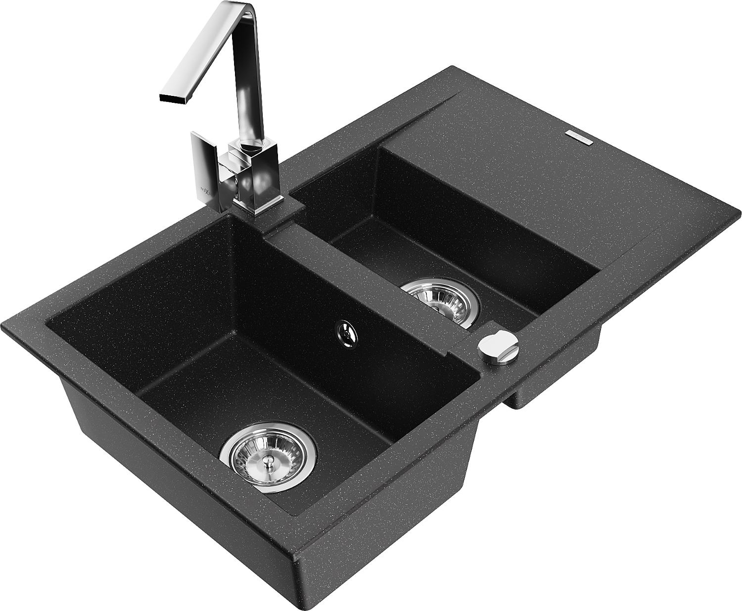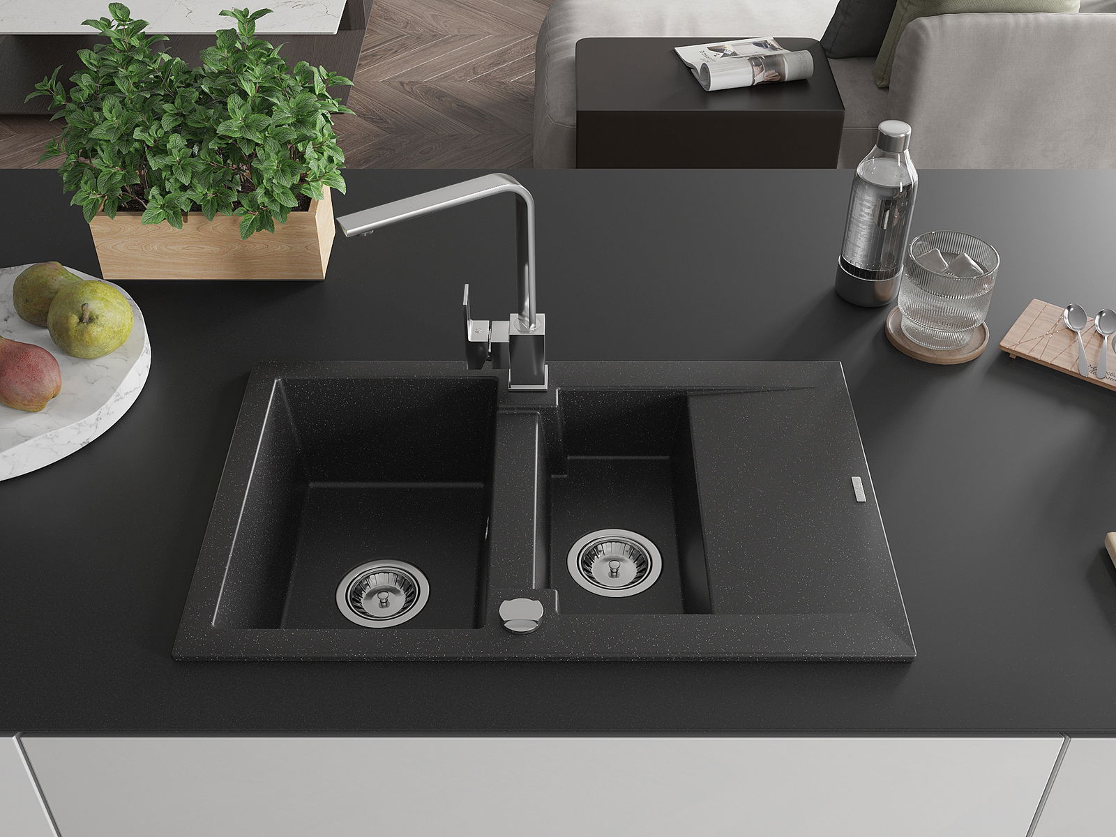 Mexen Gaspar zlewozmywak granitowy 1,5-komorowy z ociekaczem i baterią kuchenną Rita, czarny/srebrny metalik - 6507-73-670300-00