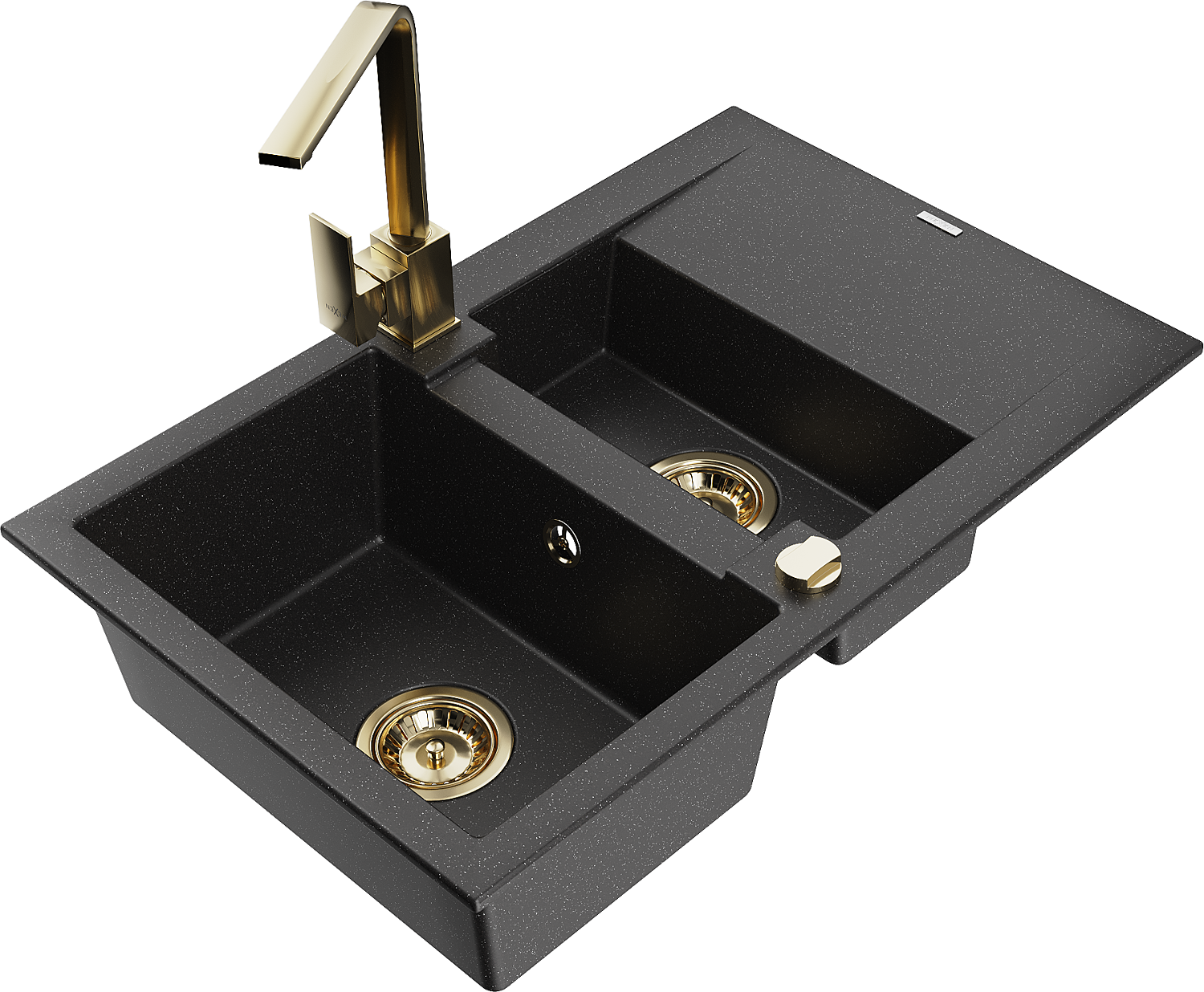 Mexen Gaspar zlewozmywak granitowy 1,5-komorowy z ociekaczem i baterią kuchenną Rita, czarny/srebrny metalik - 6507-73-670300-50