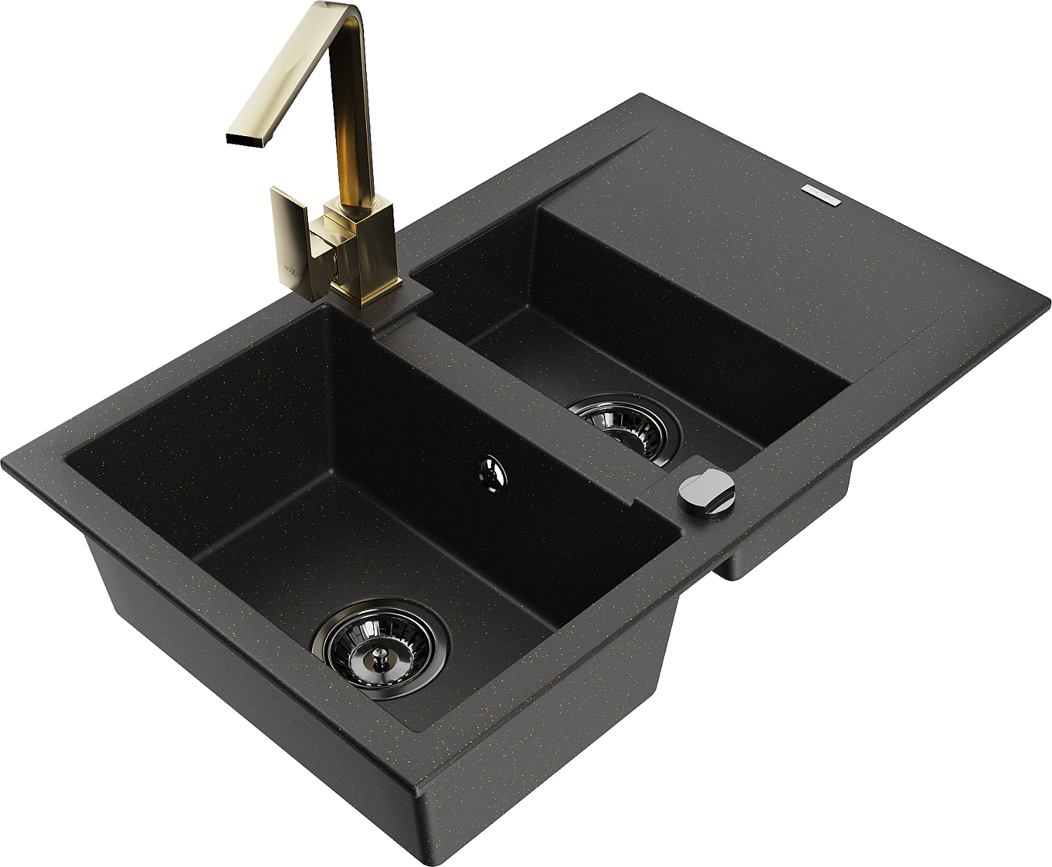 Mexen Gaspar zlewozmywak granitowy 1,5-komorowy z ociekaczem i baterią kuchenną Rita, czarny/złoty - 6507-75-670300-50-B